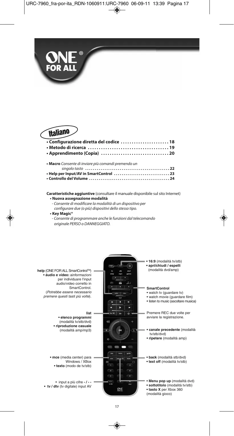 Scarica le istruzioni per il tuo Telecomando universale in formato PDF gratuitamente! Trova il tuo manuale URC 7962 - ONE FOR ALL e riprendi in mano il tuo dispositivo elettronico. In questa pagina sono pubblicati tutti i documenti necessari per l'utilizzo del tuo dispositivo. URC 7962 del marchio ONE FOR ALL.
