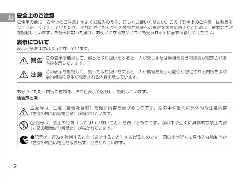お守りいただく内容の種類を、次の絵表示で区分し、説明しています。 絵表示の例 記 号 は、 注 意( 警 告 を 含 む ) を 促 す 内 容 を 告 げ る も の で す。 図 の 中 や 近 く に 具 体 的 な 注 意 内 容 (左図の場合は感電注意)が描かれています。 記号は、禁止の行為(してはいけないこと)を告げるものです。図の中や近くに具体的な禁止内容 (左図の場合は分解禁止)が描かれています。 ●記号は、行為を強制すること(必ずすること)を告げるものです。図の中や近くに具体的な強制内容 (左図の場合は電池を取り出す)が描かれています。