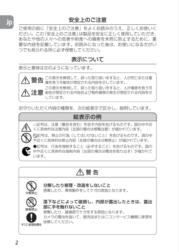 “effektive Blendenzahl”, und die Belichtungskorrektur für die Änderung der effektiven Blendenzahl wird als “Belichtungsfaktor” bezeichnet. Remarques concernant une utilisation en toute sécuritév ATTENTION Ne démontez pas le matériel Le fait de toucher aux pièces internes de l’appareil ou de l’objectif pourrait entraîner des blessures. Les réparations doivent être effectuées uniquement par des techniciens qualifiés. Si l’appareil ou l’objectif est cassé suite à une chute ou un autre accident, apportez le produit dans un centre de service agréé Nikon pour le faire vérifier après avoir débranché le produit et/ou retiré l'accumulateur ou les piles.