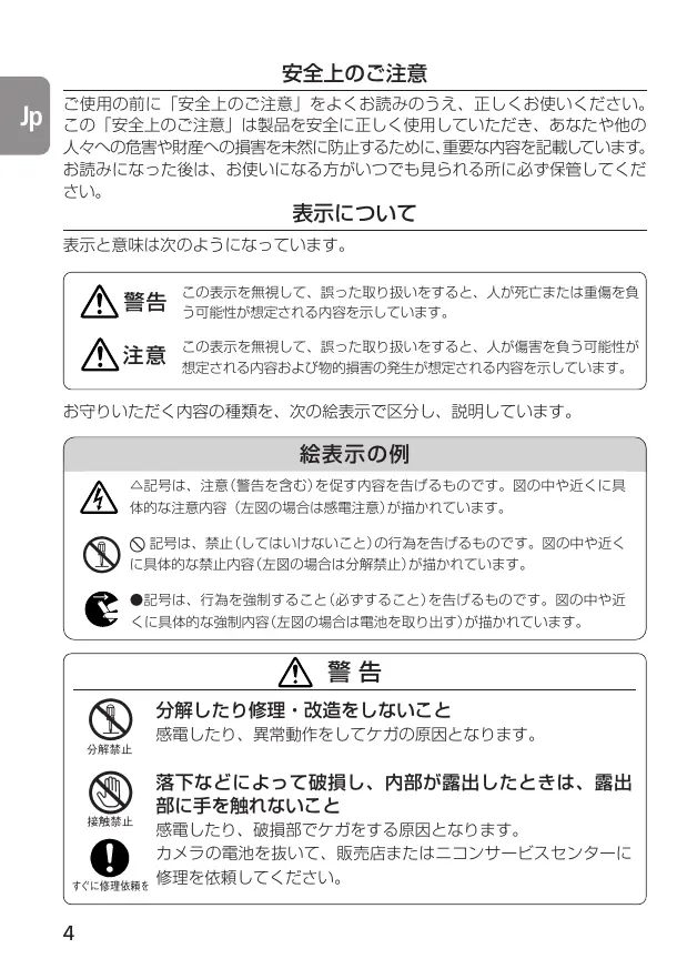 Remarques concernant une utilisation en toute sécurité En cas de dysfonctionnement, éteignez immédiatement Si vous remarquez de la fumée ou une odeur inhabituelle se dégageant de l’appareil photo ou de l’objectif, retirez immédiatement l’accumulateur ou les piles, en prenant soin de ne pas vous brûler. Continuer d’utiliser son matériel peut entraîner des blessures. Après avoir retiré ou débranché la source d’alimentation, confiez votre matériel à un centre de service agréé Nikon pour le faire vérifier. N’utilisez pas l’appareil photo ou l’objectif en présence de gaz inflammable N’utilisez pas de matériel électronique en présence de gaz inflammable car cela risque de provoquer une explosion ou un incendie. Ne regardez pas le soleil dans l’objectif ou le viseur Regarder le soleil ou tout autre source lumineuse violente dans l’objectif ou le viseur peut provoquer de graves lésions oculaires irréversibles. Tenez hors de portée des enfants Faites extrêmement attention à ce que les enfants ne mettent pas à la bouche les accumulateurs/piles ou d’autres petites pièces. Observez les précautions suivantes lorsque vous manipulez l’appareil et l’objectif • Maintenez l’appareil et l’objectif au sec. Le non-respect de cette précaution peut provoquer un incendie ou une électrocution. • Ne manipulez pas et ne touchez pas le matériel avec les mains humides. Le nonrespect de cette précaution peut provoquer une électrocution. • Lorsque vous n’utilisez pas l’objectif pendant une longue période, fixez les bouchons avant et arrière et rangez l’objectif à l’abri de la lumière directe du soleil. Le nonrespect de cette précaution peut provoquer un incendie, car l’objectif peut concentrer la lumière du soleil sur un objet.
