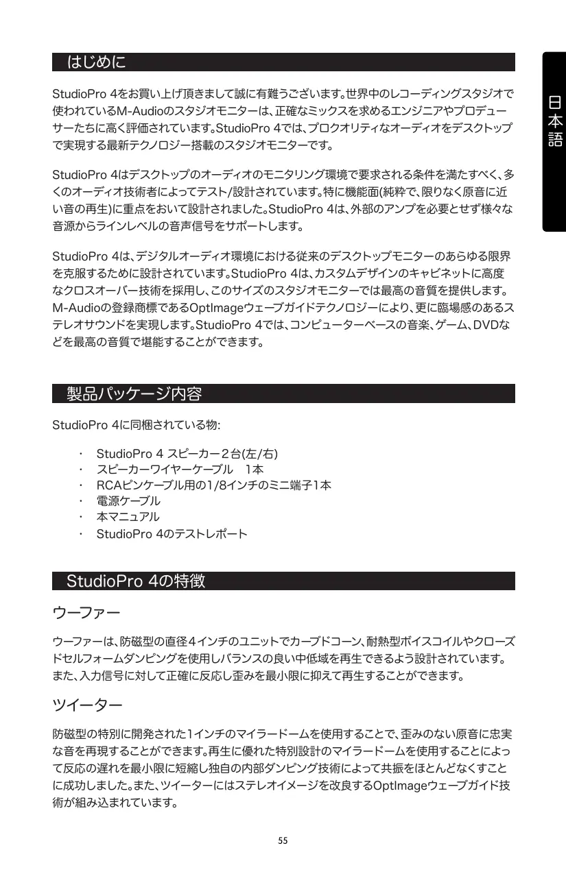 StudioPro 4をお買い上げ頂きまして誠に有難うございます。 世界中のレコーディングスタジオで 使われているM-Audioのスタジオモニターは、 正確なミックスを求めるエンジニアやプロデュー サーたちに高く評価されています。 StudioPro 4では、 プロクオリティなオーディオをデスクトップ で実現する最新テクノロジー搭載のスタジオモニターです。 StudioPro 4はデスクトップのオーディオのモニタリング環境で要求される条件を満たすべく、 くのオーディオ技術者によってテスト/設計されています。