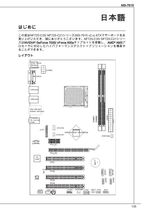 ごの度はNF725-C35/ NF725-C21シリーニス(MS-7615 v2.x)ATXマサイーリトを買上いけたき、説にありがとごさります。NF725-C35/ NF725-C21シリーニスはNVIDIA® GeForce 7025/nForce 630aチツpledソットを搭載し、AMD®AM3Proせドクさ対応たるハイバフロールデスケトツpledソリューニnhを構築るごとがてります。