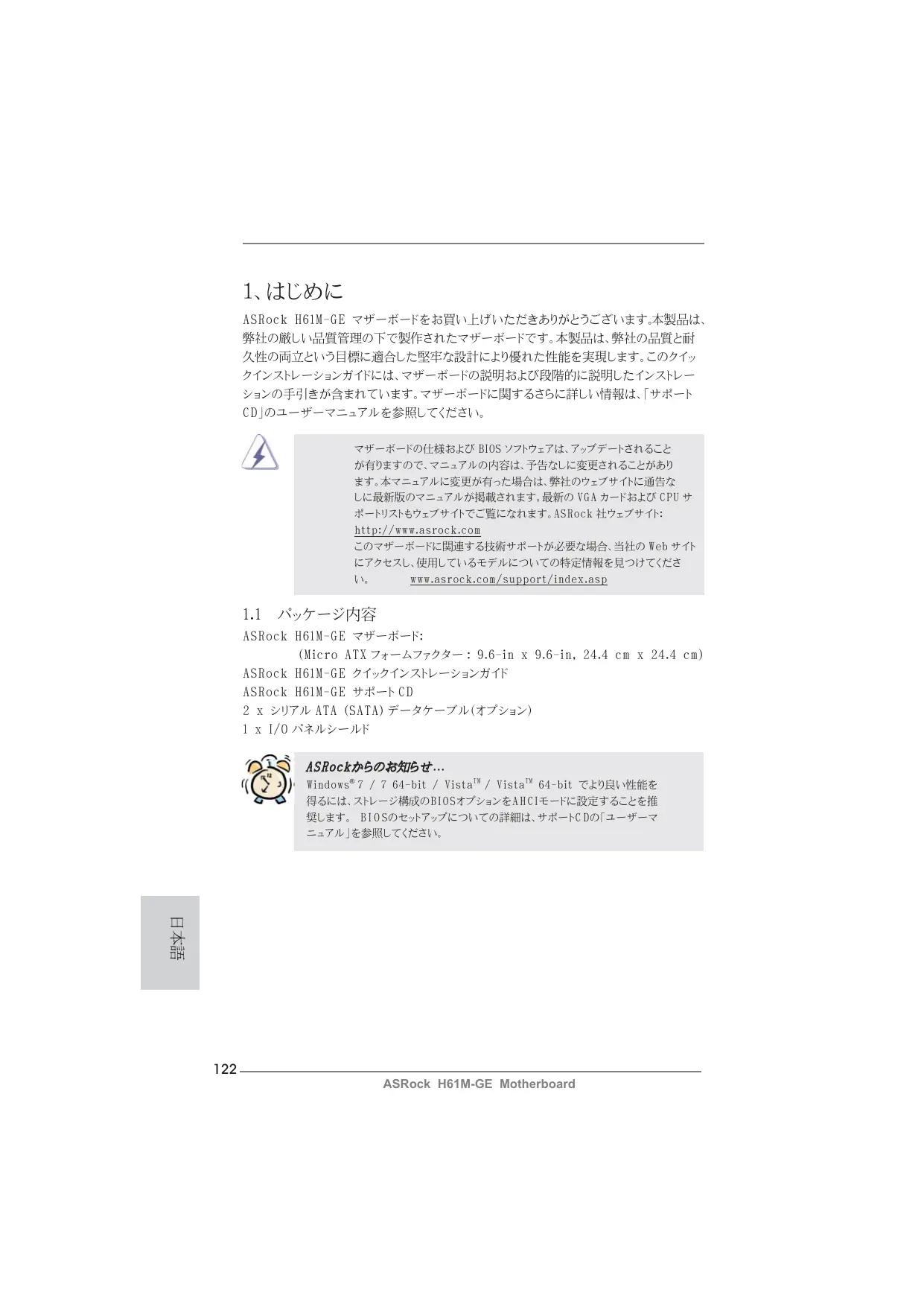 ASRock H61M-GE マザーボード: (Micro ATX フォームファクター : 9.6-in x 9.6-in, 24.4 cm x 24.4 cm) ASRock H61M-GE クイックインストレーションガイド ASRock H61M-GE サポート CD 2 x シリアル ATA (SATA) データケーブル(オプション) 1 x I/O パネルシールド ASRockからのお知らせ ... Windows® 7 / 7 64-bit / VistaTM / VistaTM 64-bit でより良い性能を 得るには、ストレージ構成のBIOSオプションをAHCIモードに設定することを推 奨します。 B I O Sのセットアップについての詳細は、サポートC Dの「ユーザーマ ニュアル」を参照してください。