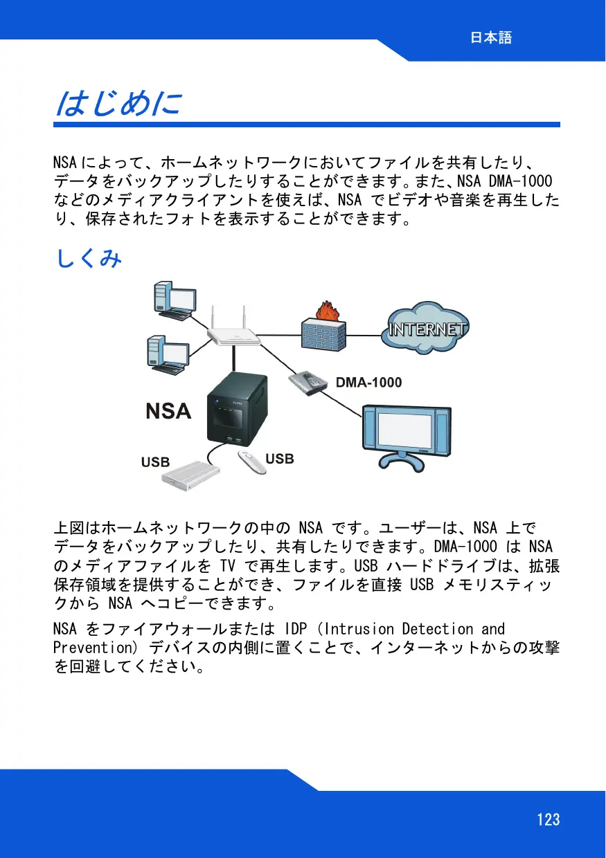 上図はホームネットワークの中の NSA です。ユーザーは、NSA 上で データをバックアップしたり、共有したりできます。DMA-1000 は NSA のメディアファイルを TV で再生します。USB ハードドライブは、拡張 保存領域を提供することができ、ファイルを直接 USB メモリスティッ クから NSA へコピーできます。 NSA をファイアウォールまたは IDP (Intrusion Detection and Prevention) デバイスの内側に置くことで、インターネットからの攻撃 を回避してください。