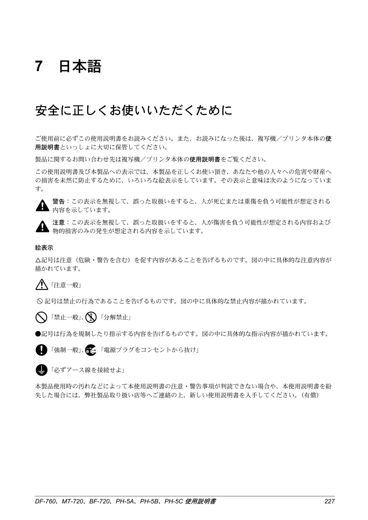 「電源プラグをコンセントから抜け」 「必ずアース線を接続せよ」 本製品使用時の汚れなどによって本使用説明書の注意・警告事項が判読できない場合や、本使用説明書を紛 失した場合には、弊社製品取り扱い店等へご連絡の上、新しい使用説明書を入手してください。(有償) DF-760、MT-720、BF-720、PH-5A、PH-5B、PH-5C 使用説明書