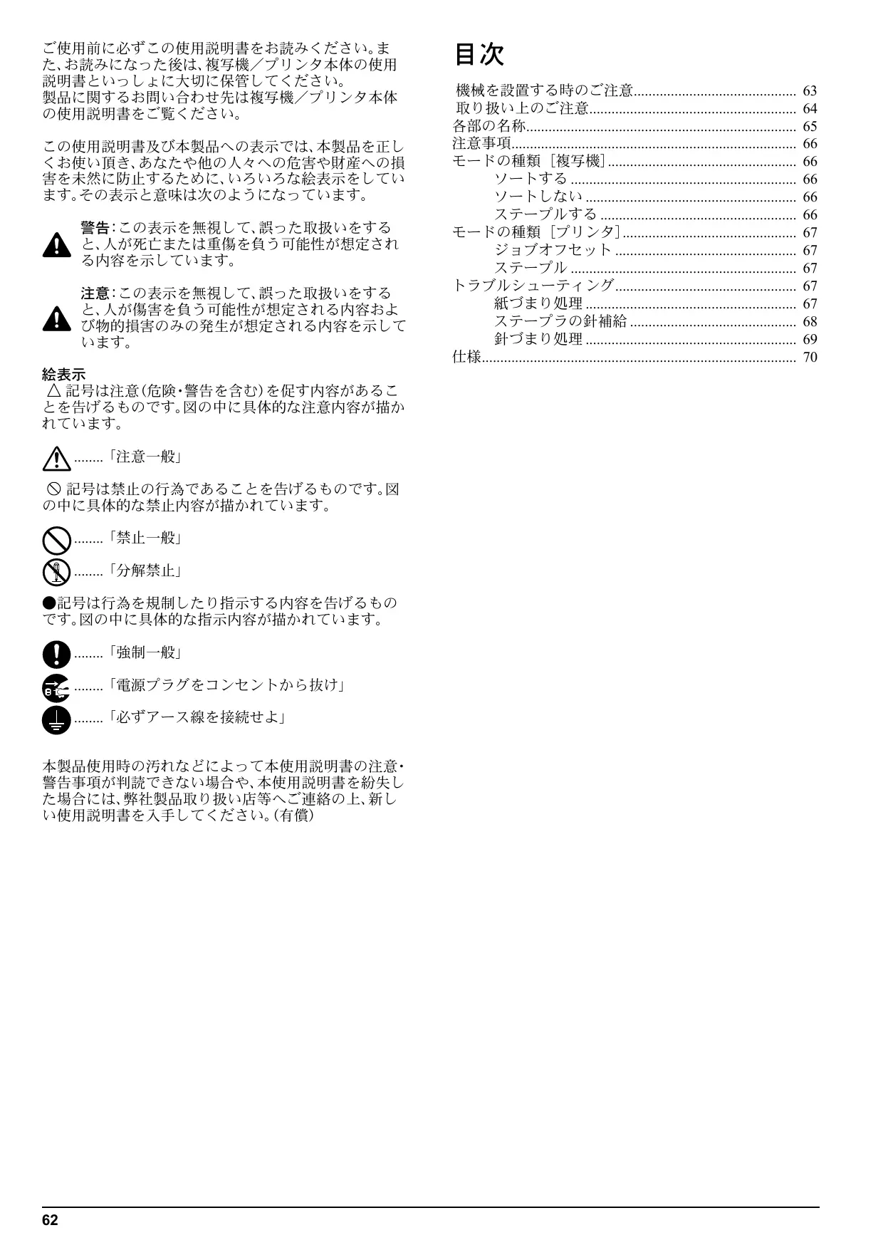 記号は注意(危険・警告を含む)を促す内容があるこ とを告げるものです。図の中に具体的な注意内容が描か ........「注意一般」 記号は禁止の行為であることを告げるものです。図 の中に具体的な禁止内容が描かれています。 ........「禁止一般」 ........「分解禁止」 ●記号は行為を規制したり指示する内容を告げるもの です。図の中に具体的な指示内容が描かれています。 ........「強制一般」 ........「電源プラグをコンセントから抜け」 ........「必ずアース線を接続せよ」 本製品使用時の汚れなどによって本使用説明書の注意・ 警告事項が判読できない場合や、本使用説明書を紛失し た場合には、弊社製品取り扱い店等へご連絡の上、新し い使用説明書を入手してください。