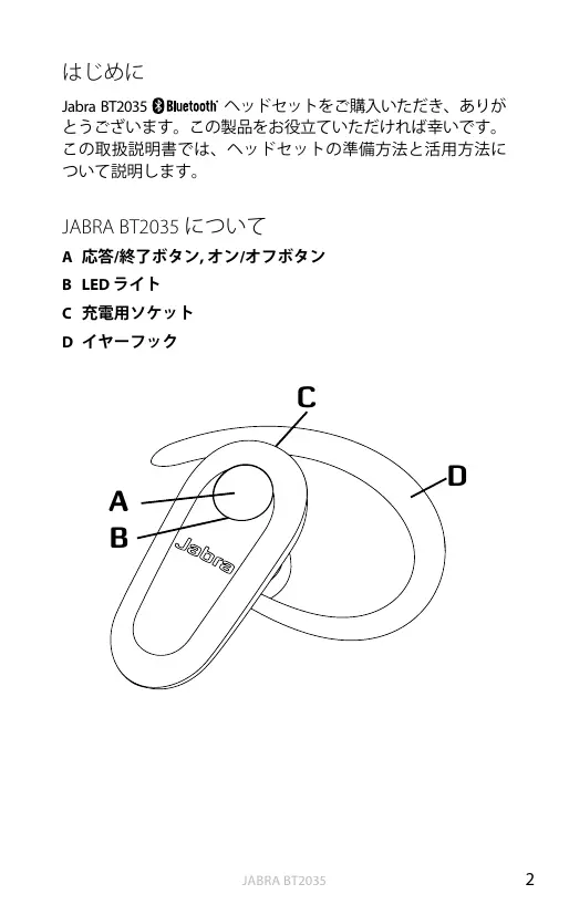 はじめに Jabra BT2035 ヘッドセットをご購入いただき、ありが とうございます。この製品をお役立ていただければ幸いです。 この取扱説明書では、ヘッドセットの準備方法と活用方法に ついて説明します。