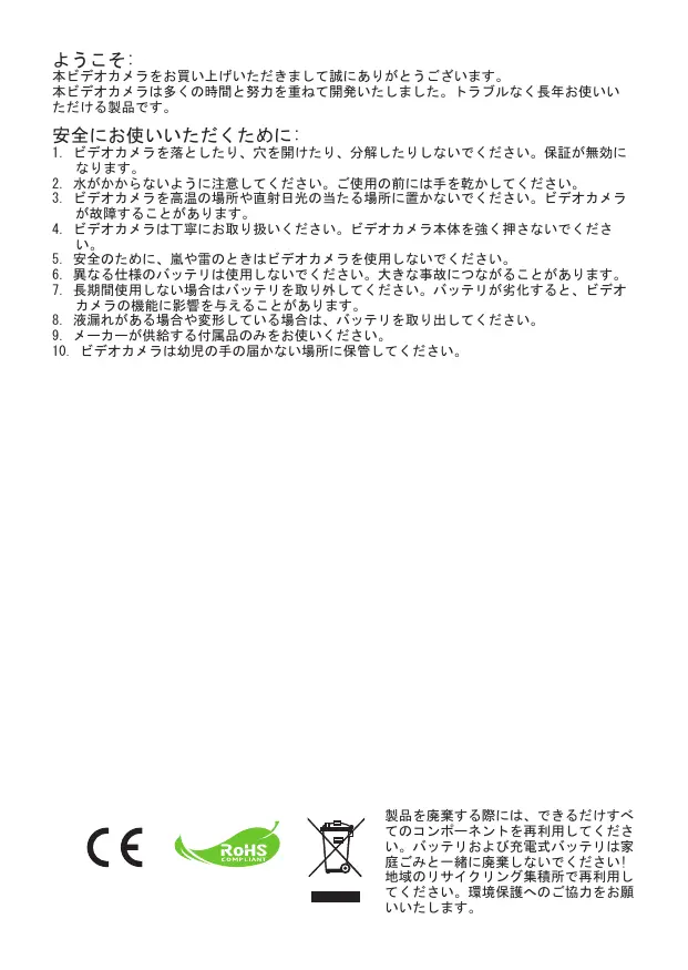 安全にお使いいただくために: 1. ビデオカメラを落としたり、穴を開けたり、分解したりしないでください。保証が無効に なります。 2. 水がかからないように注意してください。ご使用の前には手を乾かしてください。 3. ビデオカメラを高温の場所や直射日光の当たる場所に置かないでください。ビデオカメラ が故障することがあります。 4. ビデオカメラは丁寧にお取り扱いください。ビデオカメラ本体を強く押さないでくださ い。 5. 安全のために、嵐や雷のときはビデオカメラを使用しないでください。 6. 異なる仕様のバッテリは使用しないでください。大きな事故につながることがあります。 7. 長期間使用しない場合はバッテリを取り外してください。バッテリが劣化すると、ビデオ カメラの機能に影響を与えることがあります。 8. 液漏れがある場合や変形している場合は、バッテリを取り出してください。 9. メーカーが供給する付属品のみをお使いください。 10. ビデオカメラは幼児の手の届かない場所に保管してください。