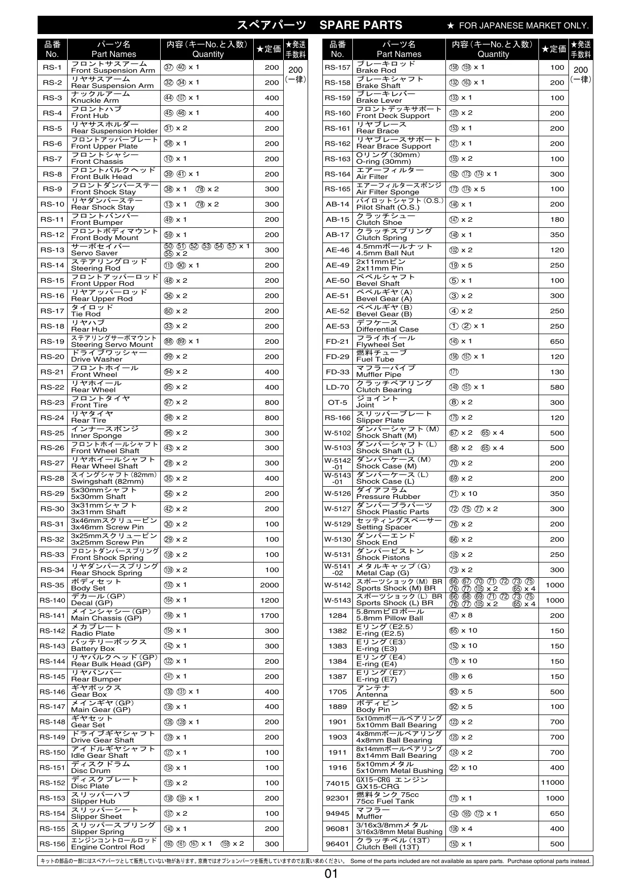 RS-157 Brake Rod RS-158 Brake Shaft RS-159 Brake Lever フロントデッキサポート RS-160 Front Deck Support RS-161 Rear Brace RS-162 Rear Brace Support Oリング (30mm) RS-163 O-ring (30mm) RS-164 Air Filter エアーフィルタースポンジ RS-165 Air Filter Sponge パイロットシャフト(O.S.) AB-14 Pilot Shaft (O.S.) AB-15 Clutch Shoe AB-17 Clutch Spring 4.5mmボールナット AE-46 4.5mm Ball Nut 2x11mmピン AE-49 2x11mm Pin AE-50 Bevel Shaft (A) AE-51 Bevel Gear (A) (B) AE-52 Bevel Gear (B) AE-53 Differential Case FD-21 Flywheel Set FD-29 Fuel Tube FD-33 Muffler Pipe LD-70 Clutch Bearing OT-5 Joint RS-166 Slipper Plate (M) W-5102 Shock Shaft (M) (L) W-5103 Shock Shaft (L) (M) W-5142 ダンパーケース Shock Case (M) (L) W-5143 ダンパーケース Shock Case (L)