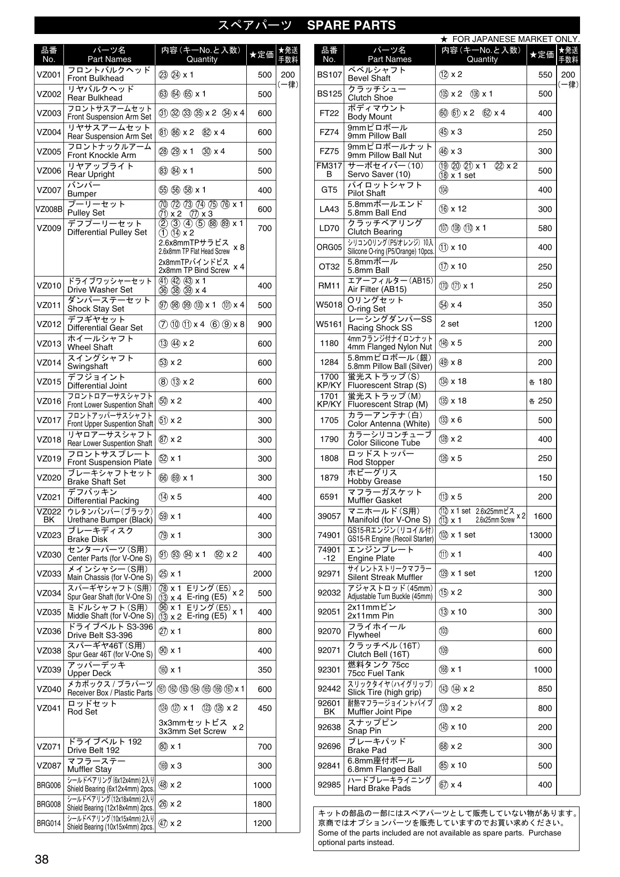 No. 23 24 x 1 70 72 73 74 75 76 x 1 VZ008B 71 x 2 77 x 3 2 3 4 5 88 89 x 1 VZ009 1 14 x 2 2.6x8mmTPサラビス 2.6x8mm TP Flat Head Screw x 8 2x8mmTPバインドビス 2x8mm TP Bind Screw x 4 ドライブワッシャーセット 41 42 43 x 1 VZ010 Drive Washer Set 36 38 39 x 4 97 98 99 100 x 1 101 x 4 VZ011 Shock Stay Set 7 10 11 x 4 6 9 x 8 VZ012 Differential Gear Set 13 44 x 2 VZ013 Wheel Shaft 53 x 2 VZ014 Swingshaft 8 13 x 2 VZ015 Differential Joint フロントロアーサスシャフト VZ016 Front Lower Suspention Shaft 50 x 2 フロントアッパーサスシャフト VZ017 Front Upper Suspention Shaft 51 x 2 リヤロアーサスシャフト VZ018 Rear Lower Suspention Shaft 87 x 2 VZ019 Front Suspension Plate 52 x 1 ブレーキシャフトセット 66 69 x 1 VZ020 Brake Shaft Set 14 x 5 VZ021 Differential Packing VZ022 ウレタンバンパー(ブラック) Urethane Bumper (Black) 59 x 1 79 x 1 VZ023 Brake Disk センターパーツ(S用) VZ030 Center Parts (for V-One S) 91 93 94 x 1 92 x 2 メインシャシー(S用) VZ033 Main Chassis (for V-One S) 25 x 1 スパーギヤシャフト(S用) 78 x 1 Eリング(E5) VZ034 Spur Gear Shaft (for V-One S) 13 x 4 E-ring (E5) ミドルシャフト(S用) 96 x 1 Eリング(E5) VZ035 Middle Shaft (for V-One S) 13 x 2 E-ring (E5) ドライブベルト S3-396 27 x 1 VZ036 Drive Belt S3-396 スパーギヤ46T(S用) VZ038 Spur Gear 46T (for V-One S) 90 x 1 160 x 1 VZ039 Upper Deck メカボックス / プラパーツ VZ040 Receiver Box / Plastic Parts 161 162 163 164 165 166 167 x 1 VZ041 Rod Set SPARE PARTS