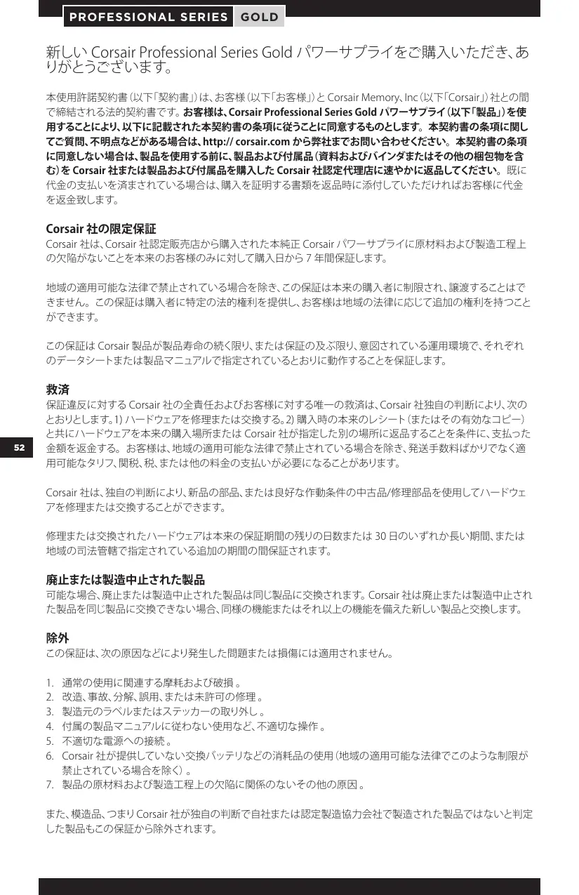 PROFESSIONAL SERIES GOLD 新しい Corsair Professional Series Gold パワーサプライをご購入いただき、あ 本使用許諾契約書(以下「契約書」)は、お客様(以下「お客様」) と Corsair Memory、Inc(以下「Corsair」)社との間 で締結される法的契約書です。お客様は、Corsair Professional Series Gold パワーサプライ
