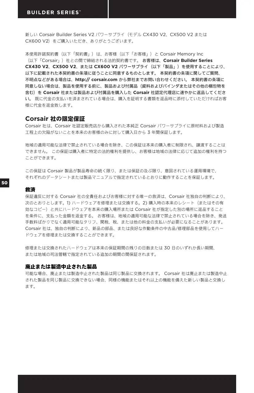 B U I L D E R S E R I E S™ 新しい Corsair Builder Series V2 パワーサプライ(モデル CX430 V2、CX500 V2 または CX600 V2)をご購入いただき、ありがとうございます。 本使用許諾契約書(以下「契約書」)は、お客様(以下「お客様」)と Corsair Memory Inc (以下「Corsair」)社との間で締結される法的契約書です。 お客様は、Corsair Builder Series CX430 V2、CX500 V2、または CX600 V2 パワーサプライ(以下「製品」)を使用することにより、 以下に記載された本契約書の条項に従うことに同意するものとします。 本契約書の条項に関してご質問、 不明点などがある場合は、http:// corsair.com から弊社までお問い合わせください。 本契約書の条項に 同意しない場合は、製品を使用する前に、製品および付属品(資料およびバインダまたはその他の梱包物を 含む)を Corsair 社または製品および付属品を購入した Corsair 社認定代理店に速やかに返品してくださ い。 既に代金の支払いを済まされている場合は、購入を証明する書類を返品時に添付していただければお客 様に代金を返金致します。 Corsair 社の限定保証 Corsair 社は、Corsair 社認定販売店から購入された本純正 Corsair パワーサプライに原材料および製造 工程上の欠陥がないことを本来のお客様のみに対して購入日から 3 年間保証します。 地域の適用可能な法律で禁止されている場合を除き、この保証は本来の購入者に制限され、譲渡することは できません。 この保証は購入者に特定の法的権利を提供し、お客様は地域の法律に応じて追加の権利を持つ この保証は Corsair 製品が製品寿命の続く限り、または保証の及ぶ限り、意図されている運用環境で、 それぞれのデータシートまたは製品マニュアルで指定されているとおりに動作することを保証します。