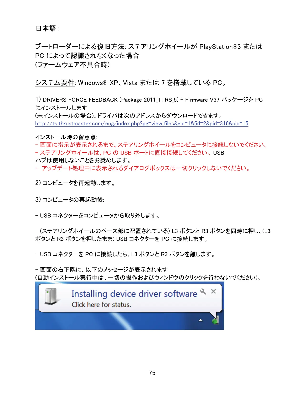 ブートローダーによる復旧方法: ステアリングホイールが PlayStation®3 または PC によって認識されなくなった場合 (ファームウェア不具合時) システム要件: Windows® XP、Vista または 7 を搭載している PC。