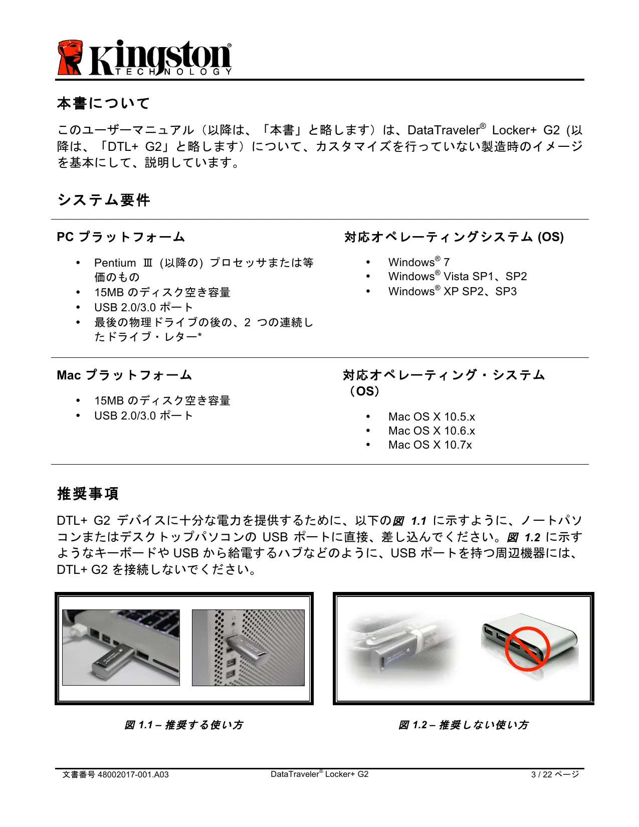 本書について このユーザーマニュアル(以降は、「本書」と略します)は、DataTraveler® Locker+ G2 (以 降は、「DTL+ G2」と略します)について、カスタマイズを行っていない製造時のイメージ を基本にして、説明しています。