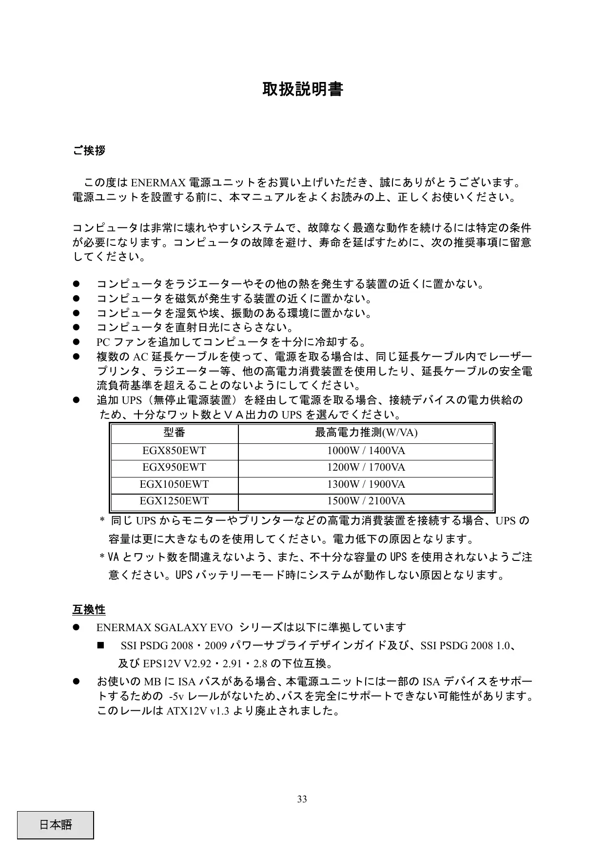 * 同じ UPS からモニターやプリンターなどの高電力消費装置を接続する場合、UPS の 容量は更に大きなものを使用してください。電力低下の原因となります。 * VA とワット数を間違えないよう、また、不十分な容量の UPS を使用されないようご注 意ください。UPS バッテリーモード時にシステムが動作しない原因となります。 互換性 ENERMAX SGALAXY EVO シリーズは以下に準拠しています SSI PSDG 2008・2009 パワーサプライデザインガイド及び、SSI PSDG 2008 1.0、 及び EPS12V V2.92・2.91・2.8 の下位互換。 お使いの MB に ISA バスがある場合、本電源ユニットには一部の ISA デバイスをサポー トするための -5v レールがないため、 バスを完全にサポートできない可能性があります。 このレールは ATX12V v1.3 より廃止されました。