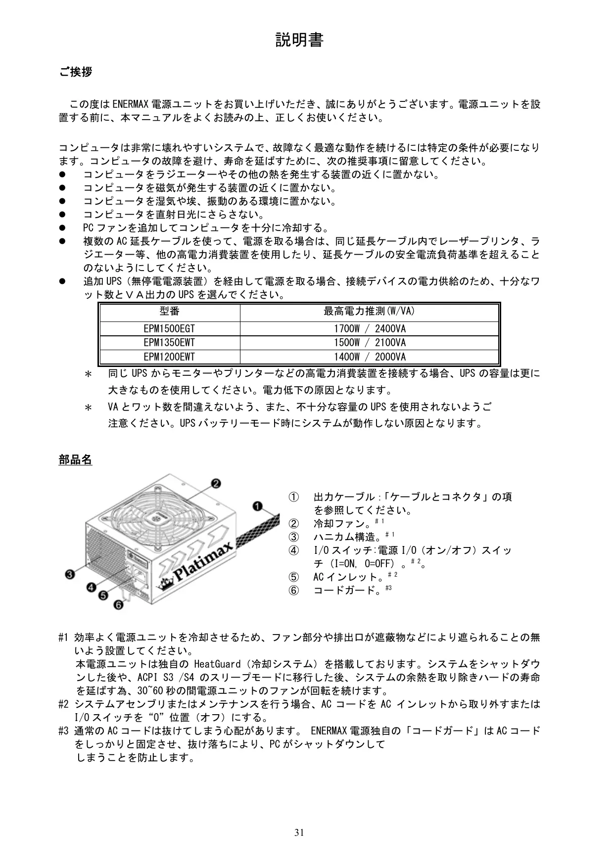 #1 効率よく電源ユニットを冷却させるため、ファン部分や排出口が遮蔽物などにより遮られることの無 いよう設置してください。 本電源ユニットは独自の HeatGuard(冷却システム)を搭載しております。システムをシャットダウ ンした後や、ACPI S3 /S4 のスリープモードに移行した後、システムの余熱を取り除きハードの寿命 を延ばす為、30~60 秒の間電源ユニットのファンが回転を続けます。 #2 システムアセンブリまたはメンテナンスを行う場合、AC コードを AC インレットから取り外すまたは I/O スイッチを“O”位置(オフ)にする。 #3 通常の AC コードは抜けてしまう心配があります。 ENERMAX 電源独自の「コードガード」は AC コード をしっかりと固定させ、抜け落ちにより、PC がシャットダウンして しまうことを防止します。