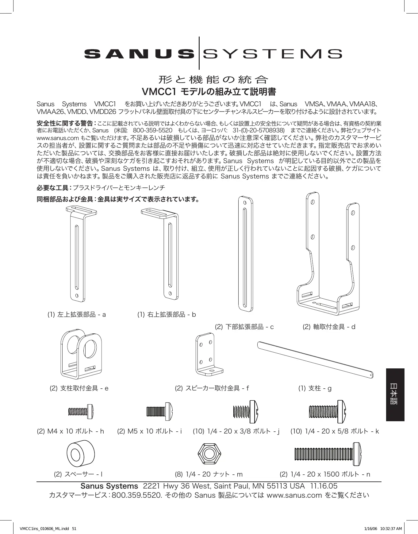 (2) 支柱取付金具 - e (2) M4 x 10 ボルト - h (2) 軸取付金具 - d (2) スピーカー取付金具 - f (2) M5 x 10 ボルト - i (2) スペーサー - l (2) 下部拡張部品 - c (1) 支柱 - g (10) 1/4 - 20 x 3/8 ボルト - j (8) 1/4 - 20 ナット - m (10) 1/4 - 20 x 5/8 ボルト - k (2) 1/4 - 20 x 1500 ボルト - n Sanus Systems 2221 Hwy 36 West, Saint Paul, MN 55113 USA 11.16.05 カスタマーサービス:800.359.5520. その他の Sanus 製品については www.sanus.com をご覧ください VMCC1ins_010606_ML.indd 51 1/16/06 10:32:37 AM