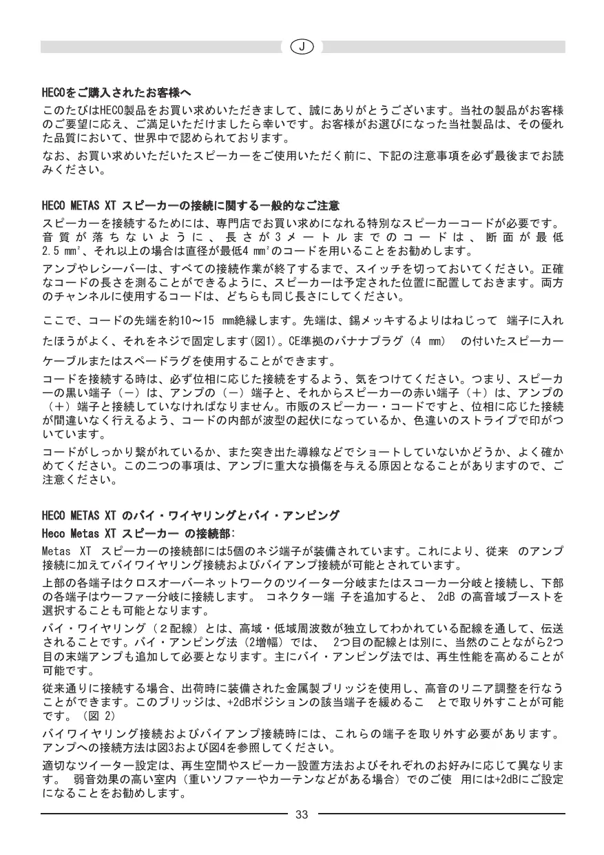 Heco Metas XT スピーカー の接続部: Metas XT スピーカーの接続部には5個のネジ端子が装備されています。これにより、従来 のアンプ 接続に加えてバイワイヤリング接続およびバイアンプ接続が可能とされています。 上部の各端子はクロスオーバーネットワークのツイーター分岐またはスコーカー分岐と接続し、下部 の各端子はウーファー分岐に接続します。 コネクター端 子を追加すると、 2dB の高音域ブーストを 選択することも可能となります。 バイ・ワイヤリング(2配線)とは、高域・低域周波数が独立してわかれている配線を通して、伝送 されることです。バイ・アンピング法(2増幅)では、 2つ目の配線とは別に、当然のことながら2つ 目の末端アンプも追加して必要となります。主にバイ・アンピング法では、再生性能を高めることが 従来通りに接続する場合、出荷時に装備された金属製ブリッジを使用し、高音のリニア調整を行なう ことができます。このブリッジは、+2dBポジションの該当端子を緩めるこ とで取り外すことが可能 です。(図 2) バイワイヤリング接続およびバイアンプ接続時には、これらの端子を取り外す必要があります。 アンプへの接続方法は図3および図4を参照してください。 適切なツイーター設定は、再生空間やスピーカー設置方法およびそれぞれのお好みに応じて異なりま す。 弱音効果の高い室内(重いソファーやカーテンなどがある場合)でのご使 用には+2dBにご設定 になることをお勧めします。