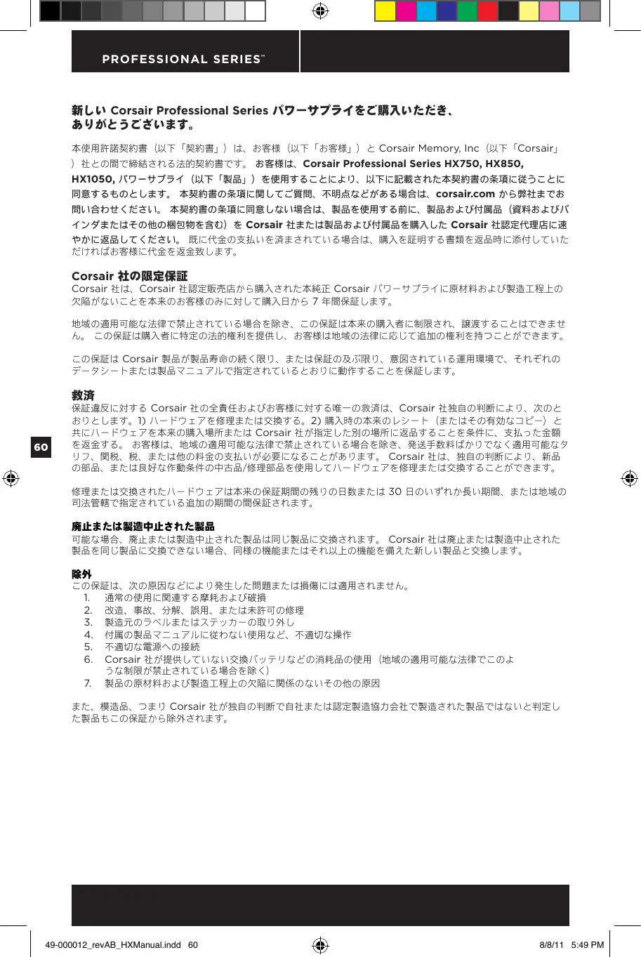8/8/11 5:49 PM PROFESSIONAL SERIES ™ 新しい Corsair Professional Series パワーサプライをご購入いただき、 ありがとうございます。 本使用許諾契約書(以下「契約書」)は、お客様(以下「お客様」)と Corsair Memory, Inc(以下「Corsair」 )社との間で締結される法的契約書です。 お客様は、Corsair Professional Series HX750, HX850, HX1050, パワーサプライ(以下「製品」)を使用することにより、以下に記載された本契約書の条項に従うことに 同意するものとします。 本契約書の条項に関してご質問、不明点などがある場合は、corsair.com から弊社までお 問い合わせください。 本契約書の条項に同意しない場合は、製品を使用する前に、製品および付属品(資料およびバ インダまたはその他の梱包物を含む)を Corsair 社または製品および付属品を購入した Corsair 社認定代理店に速 やかに返品してください。 既に代金の支払いを済まされている場合は、購入を証明する書類を返品時に添付していた だければお客様に代金を返金致します。 Corsair 社の限定保証 Corsair 社は、Corsair 社認定販売店から購入された本純正 Corsair パワーサプライに原材料および製造工程上の 欠陥がないことを本来のお客様のみに対して購入日から 7 年間保証します。 地域の適用可能な法律で禁止されている場合を除き、この保証は本来の購入者に制限され、譲渡することはできませ ん。 この保証は購入者に特定の法的権利を提供し、お客様は地域の法律に応じて追加の権利を持つことができます。 この保証は Corsair 製品が製品寿命の続く限り、または保証の及ぶ限り、意図されている運用環境で、それぞれの データシートまたは製品マニュアルで指定されているとおりに動作することを保証します。