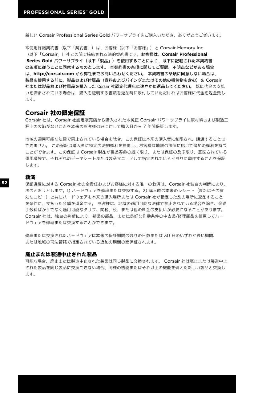 新しい Corsair Professional Series Gold パワーサプライをご購入いただき、ありがとうございます。 本使用許諾契約書(以下「契約書」)は、お客様(以下「お客様」)と Corsair Memory Inc (以下「Corsair」)社との間で締結される法的契約書です。お客様は、Corsair Professional Series Gold パワーサプライ(以下「製品」)を使用することにより、以下に記載された本契約書 の条項に従うことに同意するものとします。 本契約書の条項に関してご質問、不明点などがある場合 は、http://corsair.com から弊社までお問い合わせください。 本契約書の条項に同意しない場合は、 製品を使用する前に、製品および付属品(資料およびバインダまたはその他の梱包物を含む)を Corsair 社または製品および付属品を購入した Corsair 社認定代理店に速やかに返品してください。 既に代金の支払 いを済まされている場合は、購入を証明する書類を返品時に添付していただければお客様に代金を返金致し