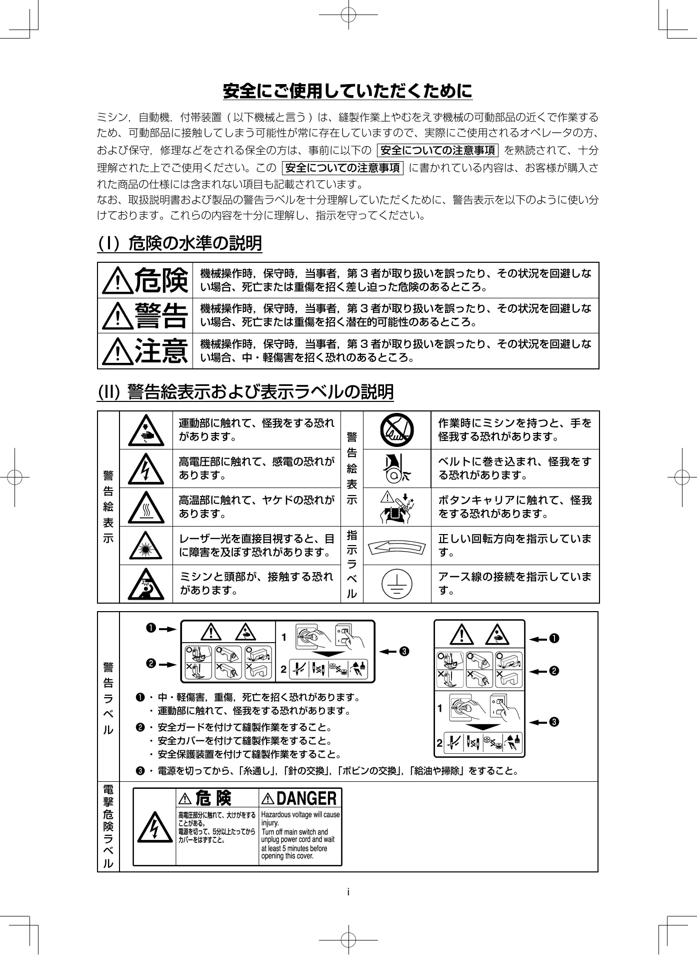 &HWWHPHQWLRQVLJQDOHXQGDQJHULPPpGLDWGHPRUWRXGHEOHVVXUHJUDYHGDQVOHFDVRODSHUVRQQHUHVSRQVDEOHRXXQWLHUV Q¶H[SORLWHSDVFRUUHFWHPHQWODPDFKLQHRXQ¶pYLWHSDVXQHVLWXDWLRQGDQJHUHXVHORUVGHVRQXWLOLVDWLRQRXGHVDPDLQWHQDQFH 1. Pour ne pas risquer une électrocution, ne pas ouvrir le couvercle de la boîte électrique du moteur ni toucher les pièces à l’intérieur de cette boîte. 1. Pour ne pas risquer de se blesser, ne jamais utiliser la machine avec son couvre-courroie, son protège-doigts ou ses autres dispositifs de sécurité retirés. 2. Pour ne pas risquer de se blesser, ne pas approcher les doigts, la tête et les vêtements du volant, de la courroie trapézoïdale ou du moteur pendant le fonctionnement car ils pourraient se prendre dans la machine. Ne rien placer non plus autour de ces pièces. 3. Pour ne pas risquer de se blesser, ne jamais mettre la main sous l’aiguille lorsqu’on place l’interrupteur d’alimentation en position de marche ou pendant le fonctionnement de la machine. 4. Pour ne pas risquer de se blesser, ne pas passer les doigts derrière le couvercle du releveur de fil pendant le fonctionnement de la machine. 5. Le crochet tourne à grande vitesse pendant le fonctionnement de la machine. Pour ne pas risquer de se blesser, ne pas placer les mains à proximité du crochet pendant le fonctionnement. Toujours mettre la machine hors tension avant de remplacer la canette. 6. Pour ne pas risquer de se blesser, ne pas mettre les doigts dans la machine lorsqu’on bascule la tête de la machine en arrière ou qu’on la relève. 7. Pour ne pas risquer un accident dû à un brusque démarrage de la machine, placer l’interrupteur d’alimentation en position d’arrêt avant de basculer la tête de la machine en arrière ou de retirer le couvre-courroie et la courroie trapézoïdale. 8. Si la machine est équipée d’un servomoteur, le moteur ne produit pas de bruit lorsque la machine est au repos. Pour ne pas risquer un accident causé par une brusque mise en marche de la machine, s’assurer que celle-ci est bien hors tension. 9. Pour ne pas risquer une électrocution, ne jamais faire fonctionner la machine avec le fil de terre de l’alimentation retiré. 10. Pour éviter un accident par électrocution ou par des pièces endommagées, placer l’interrupteur d’alimentation en position d’arrêt avant de brancher et de débrancher la fiche secteur. 11. Avant de basculer la tête de la machine en arrière, s’assurer que la barre de support de la tête de la machine est correctement en place. 12. Ce produit étant un instrument de précision, veiller à ne pas l'asperger d'eau ou d'huile et à ne pas le soumettre à des chocs en le faisant tomber.