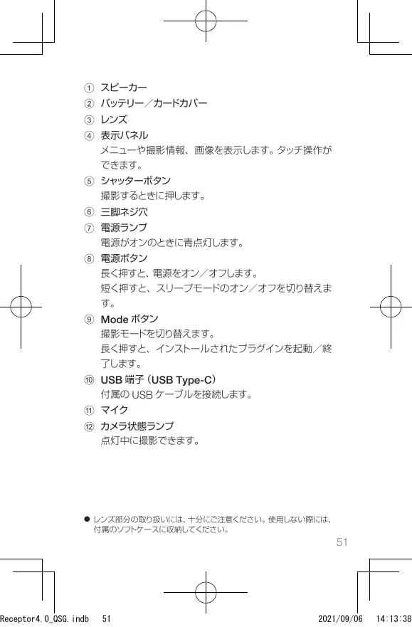 1 スピーカー 2 バッテリー/カードカバー 3 レンズ 4 表示パネル メニューや撮影情報、画像を表示します。タッチ操作が できます。 5 シャッターボタン 撮影するときに押します。 6 三脚ネジ穴 7 電源ランプ 電源がオンのときに青点灯します。 8 電源ボタン 長く押すと、電源をオン/オフします。 短く押すと、スリープモードのオン/オフを切り替えま す。 9 Mode ボタン 撮影モードを切り替えます。 長く押すと、インストールされたプラグインを起動/終 了します。 0 USB 端子(USB Type-C) 付属の USB ケーブルを接続します。 a マイク b カメラ状態ランプ 点灯中に撮影できます。