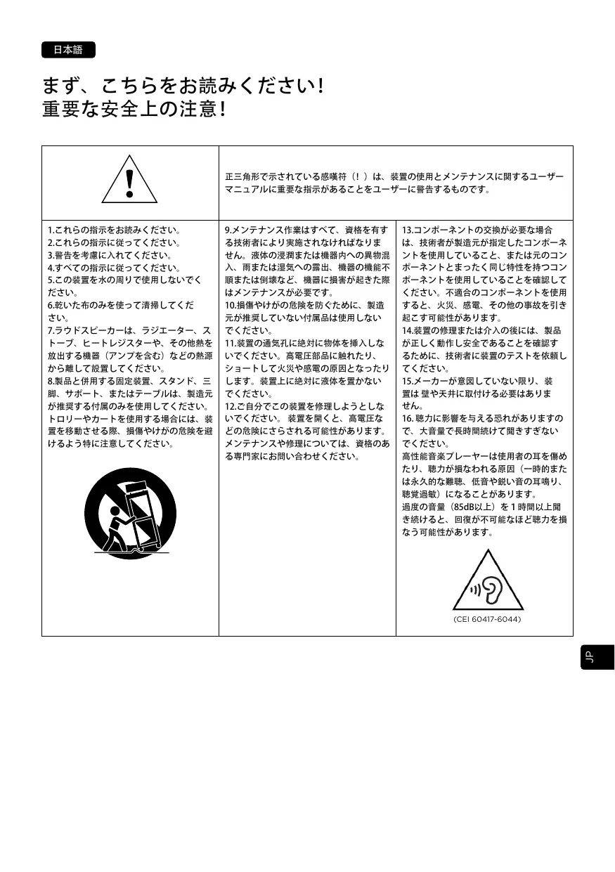 à des égouttements d’eau ou des éclaboussures. Aucun objet rempli de liquide, tel qu’un vase, ne doit être posé sur l’appareil. 12. Ne pas tenter de réparer cet appareil par ses propres moyens. L’ouverture de cet appareil peut exposer à des tensions dangereuses et à d’autres risques. Pour toute intervention de maintenance, s’adresser à un personnel qualifié. 13. Afin d’éviter des dommages auditifs éventuels, ne pas écouter les enceintes à un niveau sonore élevé pendant une longue durée. L’écoute d’enceintes à un niveau sonore excessif peut endommager l’oreille de l’utilisateur et entraîner des troubles auditifs (surdité temporaire ou définitive, bourdonnements d’oreille, acouphènes, hyperacousie). L’exposition de l’appareil auditif à un niveau supérieur à 85 dB SPL LAeq pendant plusieurs heures peut endommager l’ouïe irréversiblement.