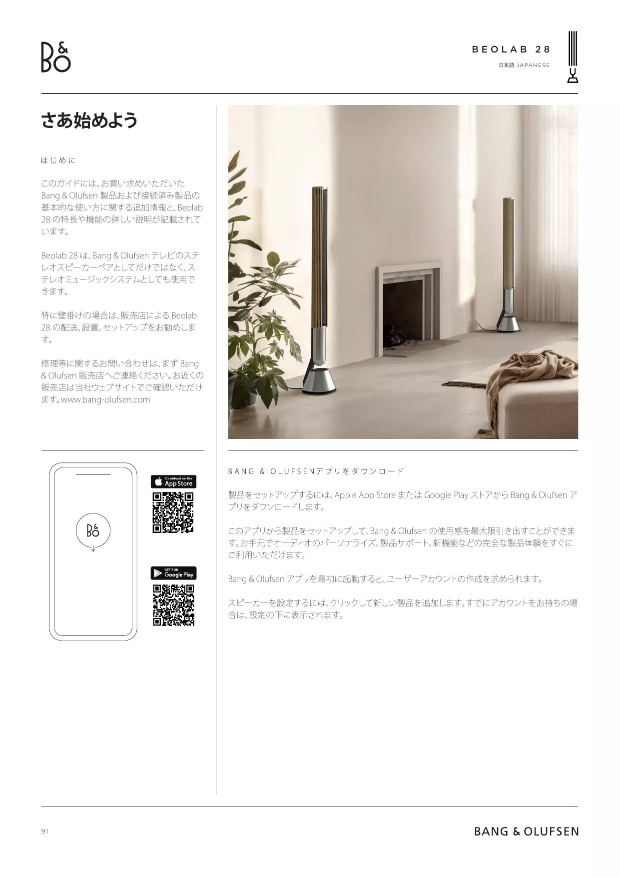 このガイドには、お買い求めいただいた Bang & Olufsen 製品および接続済み製品の 基本的な使い方に関する追加情報と、Beolab 28 の特長や機能の詳しい説明が記載されて います。 Beolab 28 は、Bang & Olufsen テレビのステ レオスピーカーペアとしてだけではなく、 ス テレオミュージックシステムとしても使用で きます。 特に壁掛けの場合は、販売店による Beolab 28 の配送、設置、セットアップをお勧めしま す。 修理等に関するお問い合わせは、 まず Bang & Olufsen 販売店へご連絡ください。お近くの 販売店は当社ウェブサイトでご確認いただけ ます。www.bang-olufsen.com
