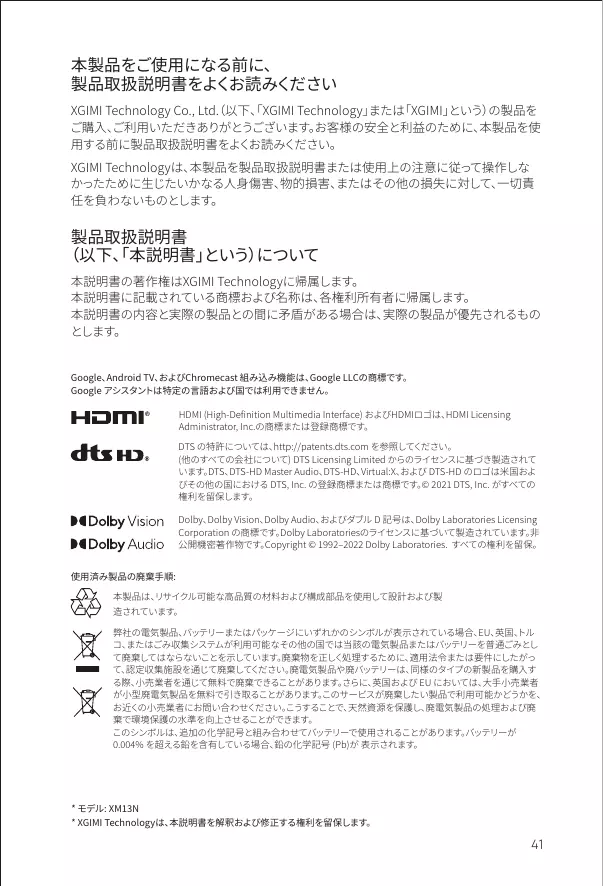 本説明書の著作権はXGIMI Technologyに帰属します。 本説明書に記載されている商標および名称は、各権利所有者に帰属します。 本説明書の内容と実際の製品との間に矛盾がある場合は、実際の製品が優先されるもの とします。 Google、Android TV、 およびChromecast 組み込み機能は、Google LLCの商標です。 Google アシスタントは特定の言語および国では利用できません。