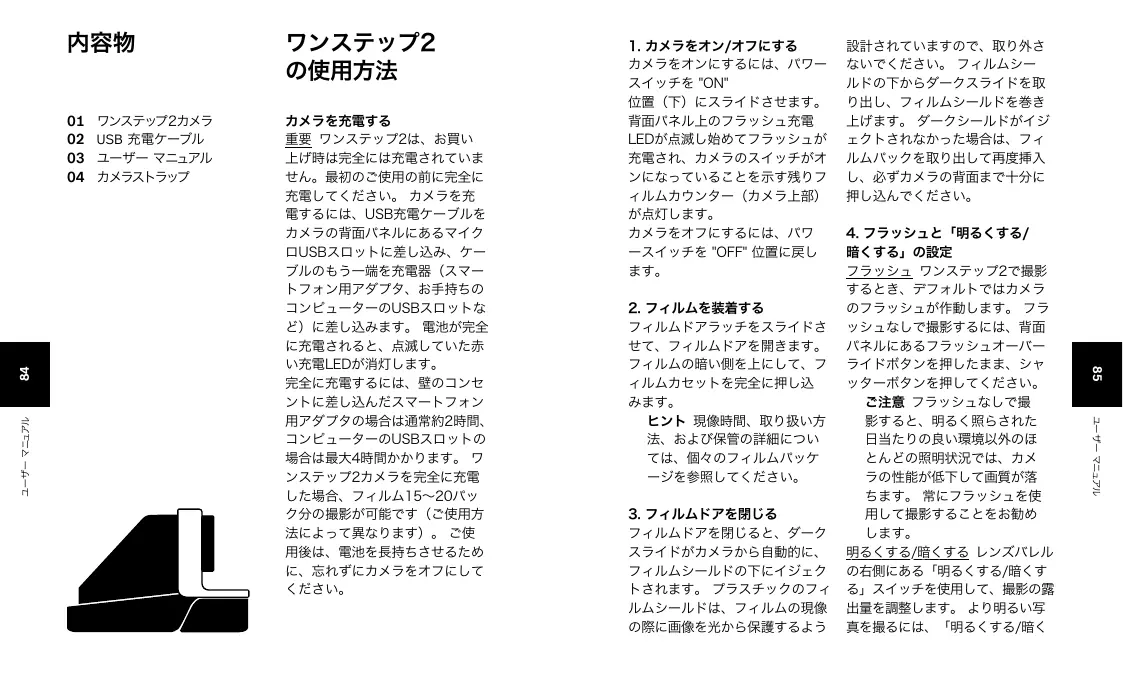 設計されていますので、取り外さ ないでください。 フィルムシー ルドの下からダークスライドを取 り出し、フィルムシールドを巻き 上げます。 ダークシールドがイジ ェクトされなかった場合は、フィ ルムパックを取り出して再度挿入 し、必ずカメラの背面まで十分に 押し込んでください。 4. フラッシュと「明るくする/ 暗くする」の設定 フラッシュ ワンステップ2で撮影 するとき、デフォルトではカメラ のフラッシュが作動します。 フラ ッシュなしで撮影するには、背面 パネルにあるフラッシュオーバー ライドボタンを押したまま、シャ ッターボタンを押してください。 ご注意 フラッシュなしで撮 影すると、明るく照らされた 日当たりの良い環境以外のほ とんどの照明状況では、カメ ラの性能が低下して画質が落 ちます。 常にフラッシュを使 用して撮影することをお勧め します。 明るくする/暗くする レンズバレル の右側にある「明るくする/暗くす る」スイッチを使用して、撮影の露 出量を調整します。 より明るい写 真を撮るには、「明るくする/暗く