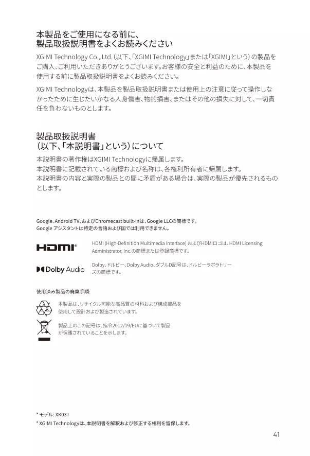 XGIMI Technology n'est aucunement responsable des préjudices corporels, matériels ou autres, en cas de non respect des précautions fournies ou du mode d'emploi du produit.