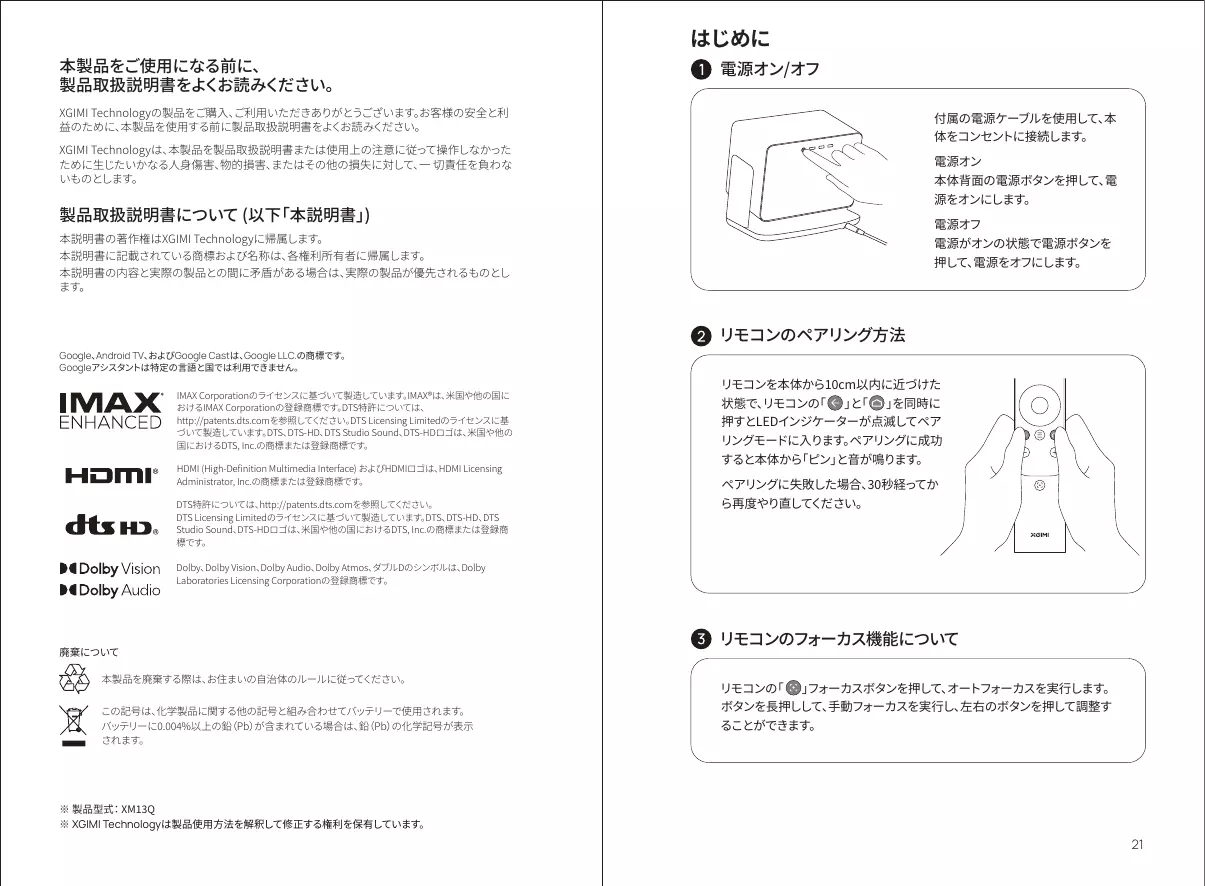 本説明書の著作権はXGIMI Technologyに帰属します。 本説明書に記載されている商標および名称は、各権利所有者に帰属します。 本説明書の内容と実際の製品との間に矛盾がある場合は、実際の製品が優先されるものとし ます。