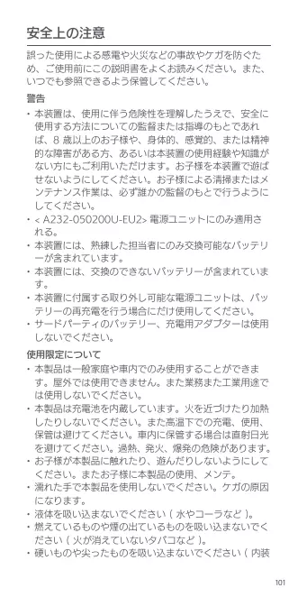 • Ce produit peut être utilisé par des enfants à partir de 8 ans, ainsi que des personnes présentant des déficiences physiques, sensorielles ou intellectuelles, ou dont l’expérience et les connaissances sont limitées sous le contrôle d’un parent ou d’un tuteur pour assurer une utilisation sécurisée et éviter tout danger. Le nettoyage et l’entretien ne doivent pas être effectués par des enfants sans surveillance. • N’utilisez que l’unité d’approvisionnement <A232050200U-EU2>. • Cet appareil contient des batteries ne pouvant être remplacées que par des personnes compétentes. • Ce produit contient des piles non remplaçables. • Pour charger la batterie, utilisez uniquement l'unité d'approvisionnement amovible fournie avec cet appareil. • N’utilisez pas de batterie, d’adaptateur d’alimentation ou de socle de charge tiers. Restrictions d’utilisation • L’aspirateur est destiné uniquement à être utilisé à domicile et dans un véhicule. Ne l’utilisez pas à l’extérieur, sous la pluie ni dans des environnements industriels. • L’aspirateur contient une batterie intégrée rechargeable. N’exposez pas l’aspirateur au feu et ne le chargez pas, ne l’utilisez pas ou ne l’entreposez pas dans un environnement à température élevée. Afin d’empêcher une surchauffe et un risque d'incendie ou d explosion, placez l’aspirateur à l’abri du soleil lorsqu'il est stocké dans un véhicule. • Gardez toujours l’aspirateur hors de la portée des enfants. • Afin d’éviter le risque de blessure, n’utilisez pas l’aspirateur avec les mains mouillées. 39