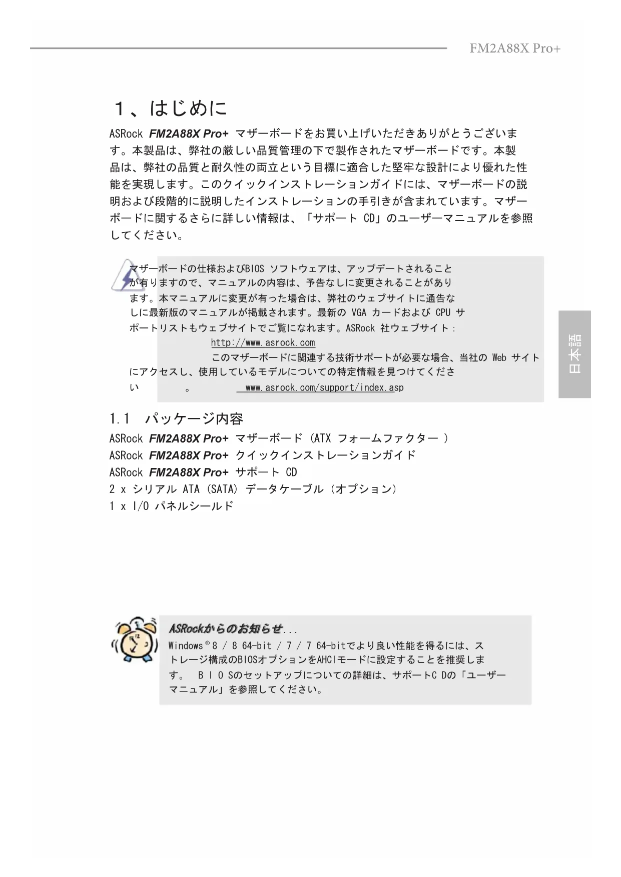 してください。 マザーボードの仕様およびBIOS ソフトウェアは、アップデートされること が有りますので、マニュアルの内容は、予告なしに変更されることがあり ます。本マニュアルに変更が有った場合は、弊社のウェブサイトに通告な しに最新版のマニュアルが掲載されます。最新の VGA カードおよび CPU サ ポートリストもウェブサイトでご覧になれます。ASRock 社ウェブサイト: http://www.asrock.com このマザーボードに関連する技術サポートが必要な場合、当社の Web サイト にアクセスし、使用しているモデルについての特定情報を見つけてくださ い。 www.asrock.com/support/index.asp 1.1 パッケージ内容