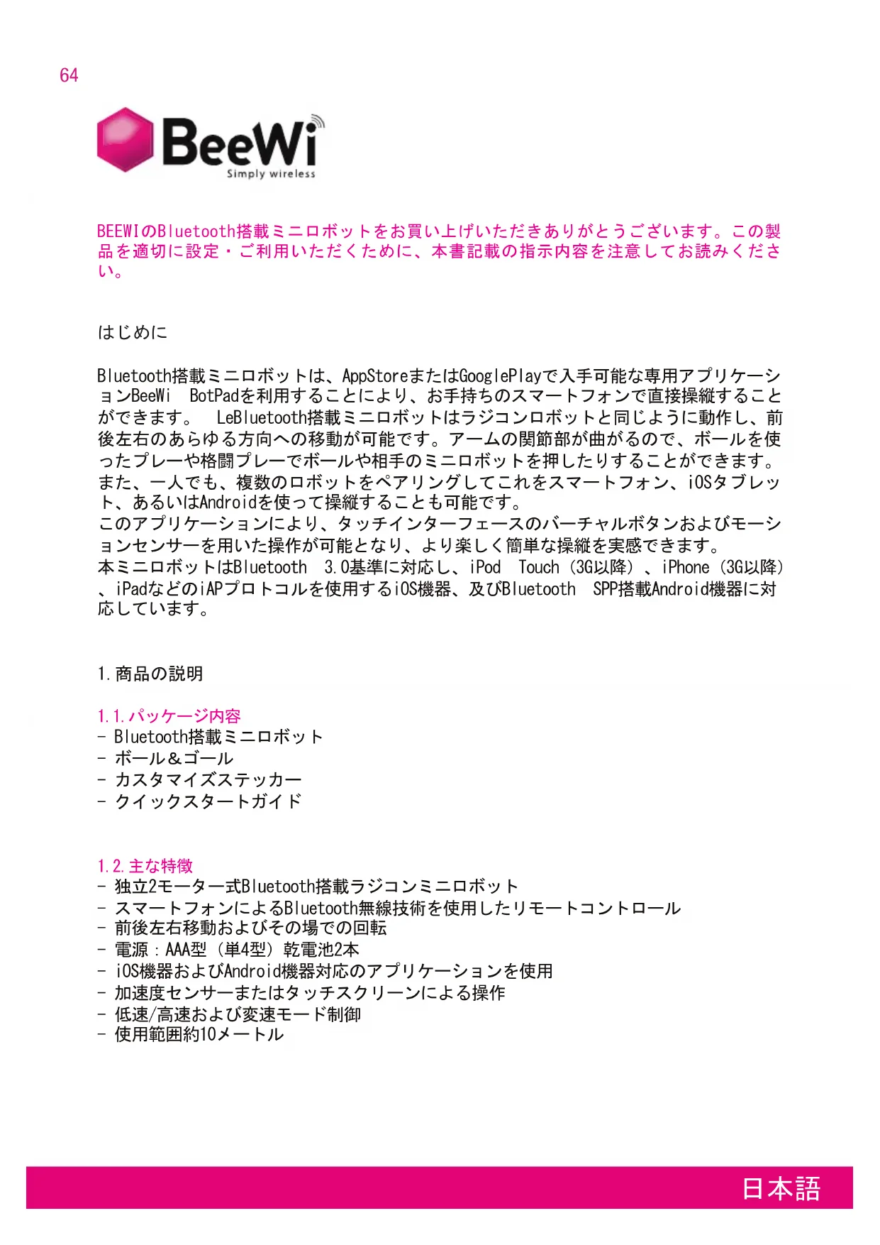BEEWIのBluetooth搭載ミニロボットをお買い上げいただきありがとうございます。この製 品を適切に設定・ご利用いただくために、本書記載の指示内容を注意してお読みくださ い。65