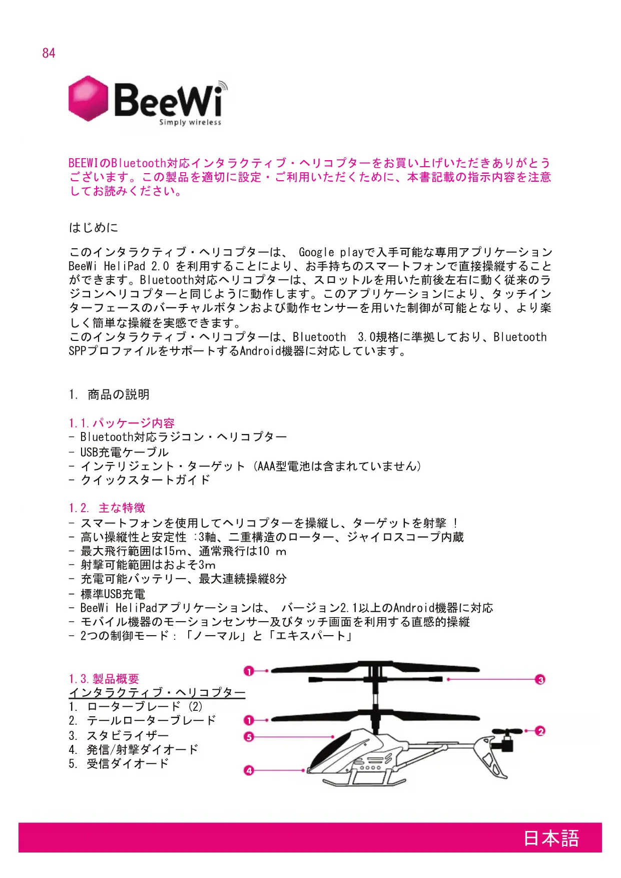 BEEWIのBluetooth対応インタラクティブ・ヘリコプターをお買い上げいただきありがとう ございます。この製品を適切に設定・ご利用いただくために、本書記載の指示内容を注意