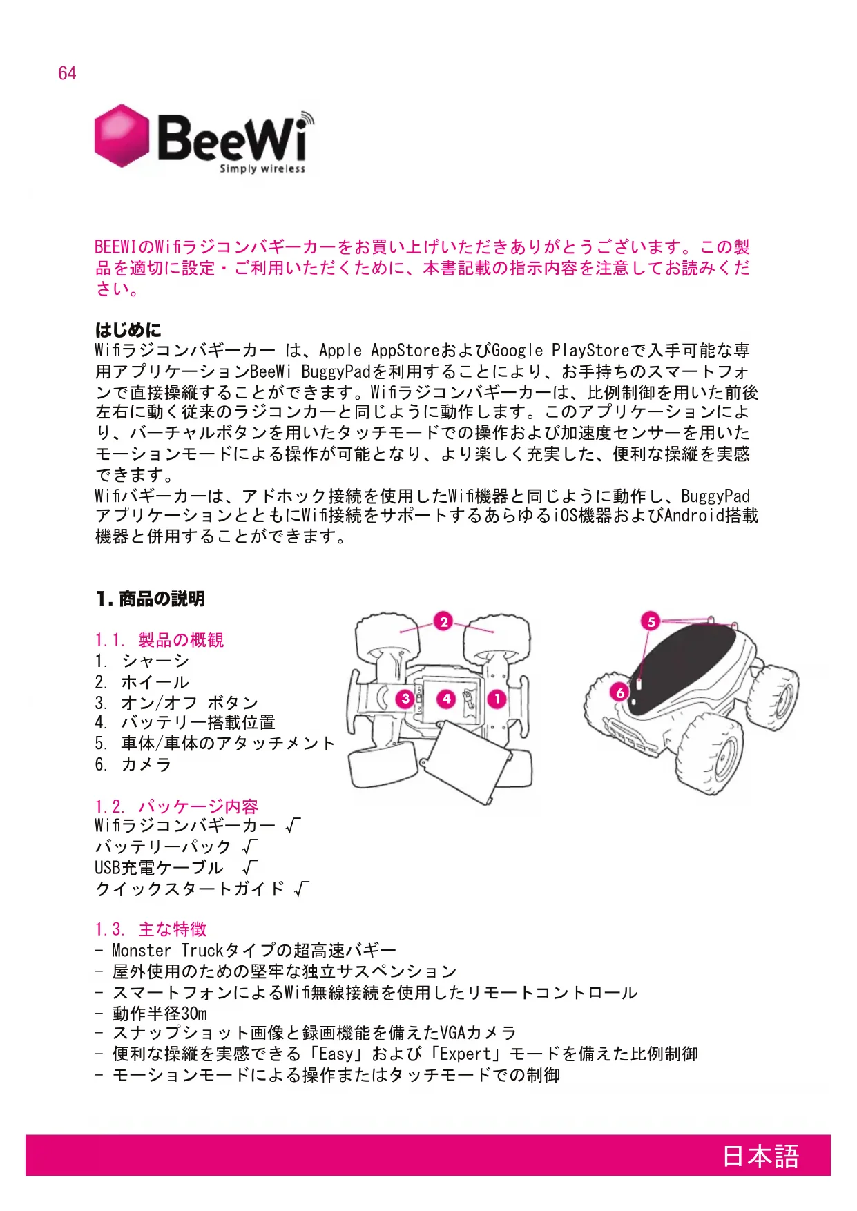BEEWIのWiラジコンバギーカーをお買い上げいただきありがとうございます。この製 品を適切に設定・ご利用いただくために、本書記載の指示内容を注意してお読みくだ