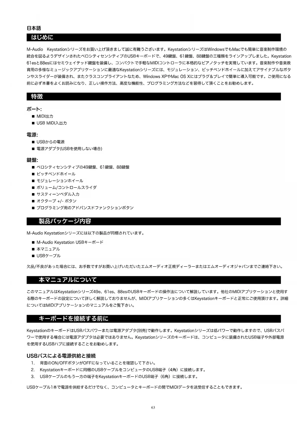 M-Audio Keystationシリーズをお買い上げ頂きまして誠に有難うございます。KeystationシリーズはWindowsでもMacでも簡単に音楽制作環境の 統合を図るようデザインされたベロシティセンシティブのUSBキーボードで、49鍵盤、61鍵盤、88鍵盤の三種類をラインアップしました。Keystation 61esと88esにはセミウェイテッド鍵盤を装備し、コンパクトで手軽なMIDIコントローラに本格的なピアノタッチを実現しています。音楽制作や音楽教 育用の多様なミュージックアプリケーションに最適なKeystationシリーズには、モジュレーション、ピッチベンドホイールに加えてアサイナブルなボタ ンやスライダーが装備され、またクラスコンプライアントなため、WindowsXPやMacOSXにはプラグ&プレイで簡単に導入可能です。ご使用になる 前に必ず本書をよくお読みになり、正しい操作方法、高度な機能性、プログラミング方法などを習得して頂くことをお勧めします。