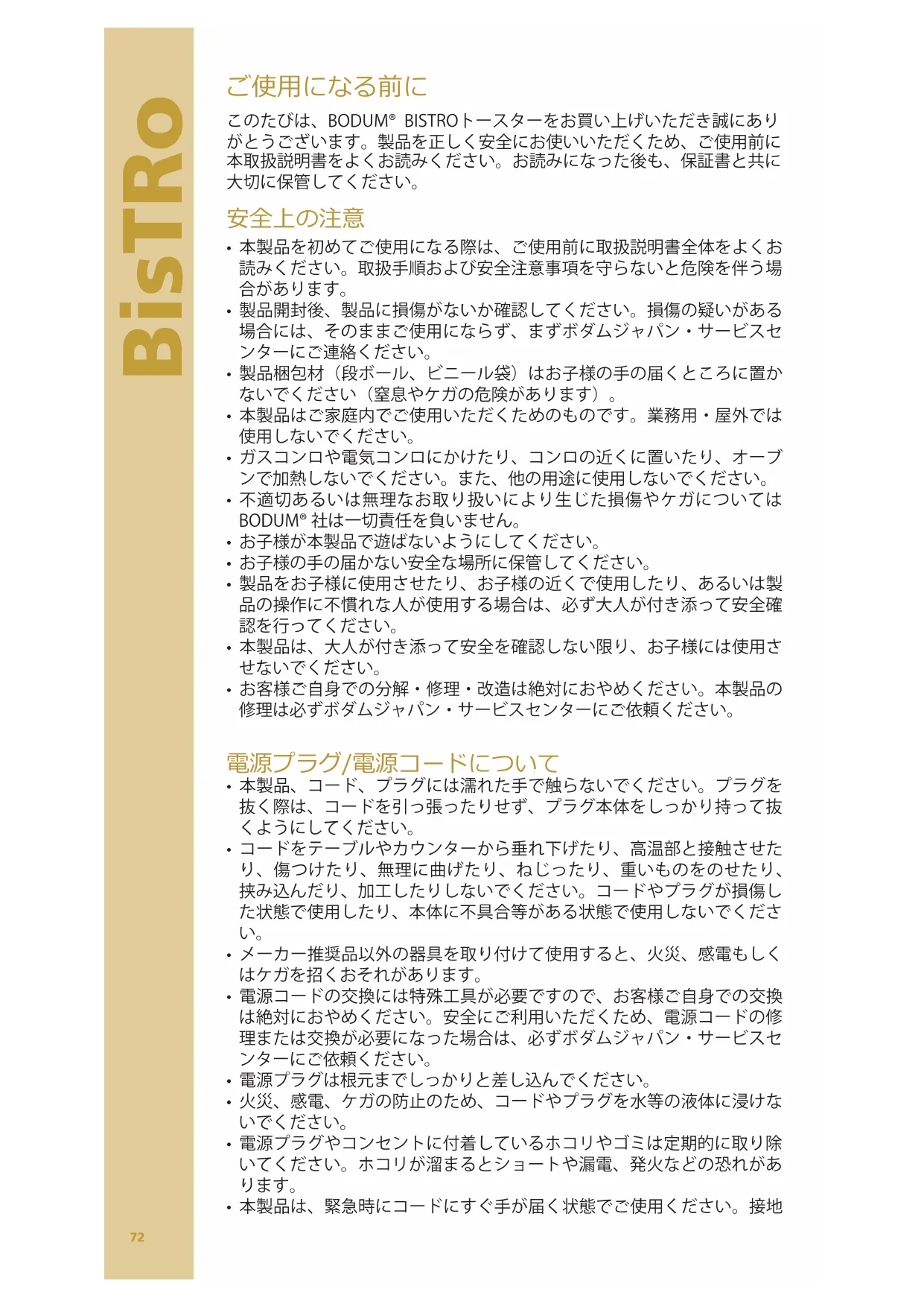 このたびは、BODUM® BISTROトースターをお買い上げいただき誠にあり がとうございます。製品を正しく安全にお使いいただくため、ご使用前に 本取扱説明書をよくお読みください。お読みになった後も、保証書と共に 大切に保管してください。