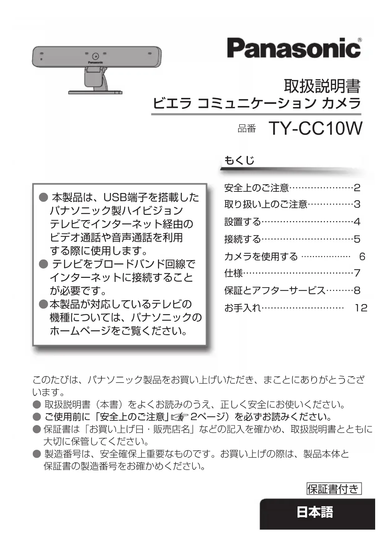 品番 このたびは、パナソニック製品をお買い上げいただき、まことにありがとうござ います。 ●取扱説明書(本書)をよくお読みのうえ、正しく安全にお使いください。●ご使用前に「安全上のご注意」(2ページ)を必ずお読みください。●保証書は「お買い上げ日・販売店名」などの記入を確かめ、取扱説明書とともに大切に保管してください。●製造番号は、安全確保上重要なものです。お買い上げの際は、製品本体と保証書の製造番号をお確かめください。 もくじ 安全上のご注意…………………2取り扱い上のご注意……………3設置する…………………………4接続する…………………………5カメラを使用する……………… 6仕様………………………………7保証とアフターサービス………8お手入れ……………………… 12 保証書付き