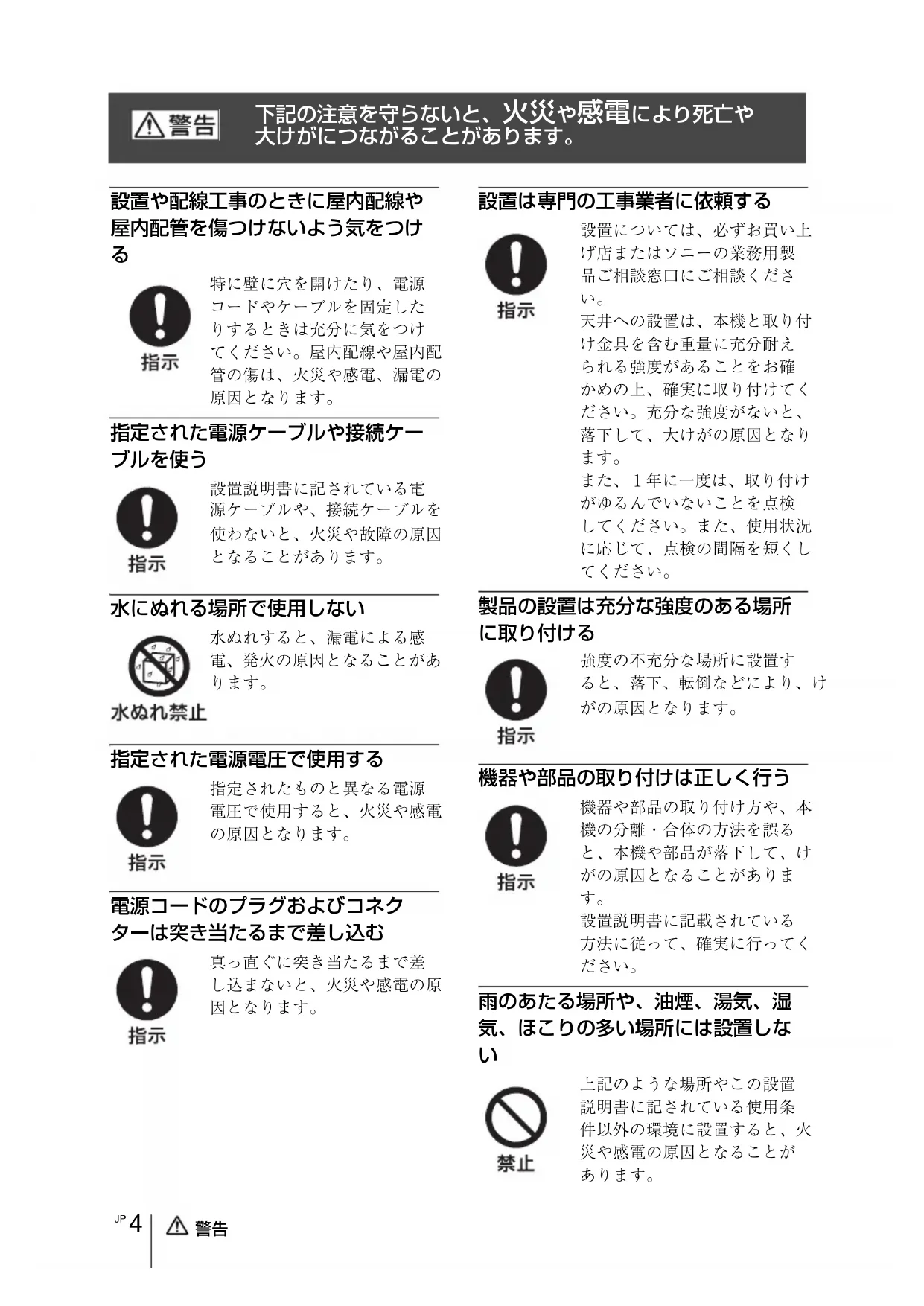 上記のような場所やこの設置 説明書に記されている使用条 件以外の環境に設置すると、火 災や感電の原因となることが