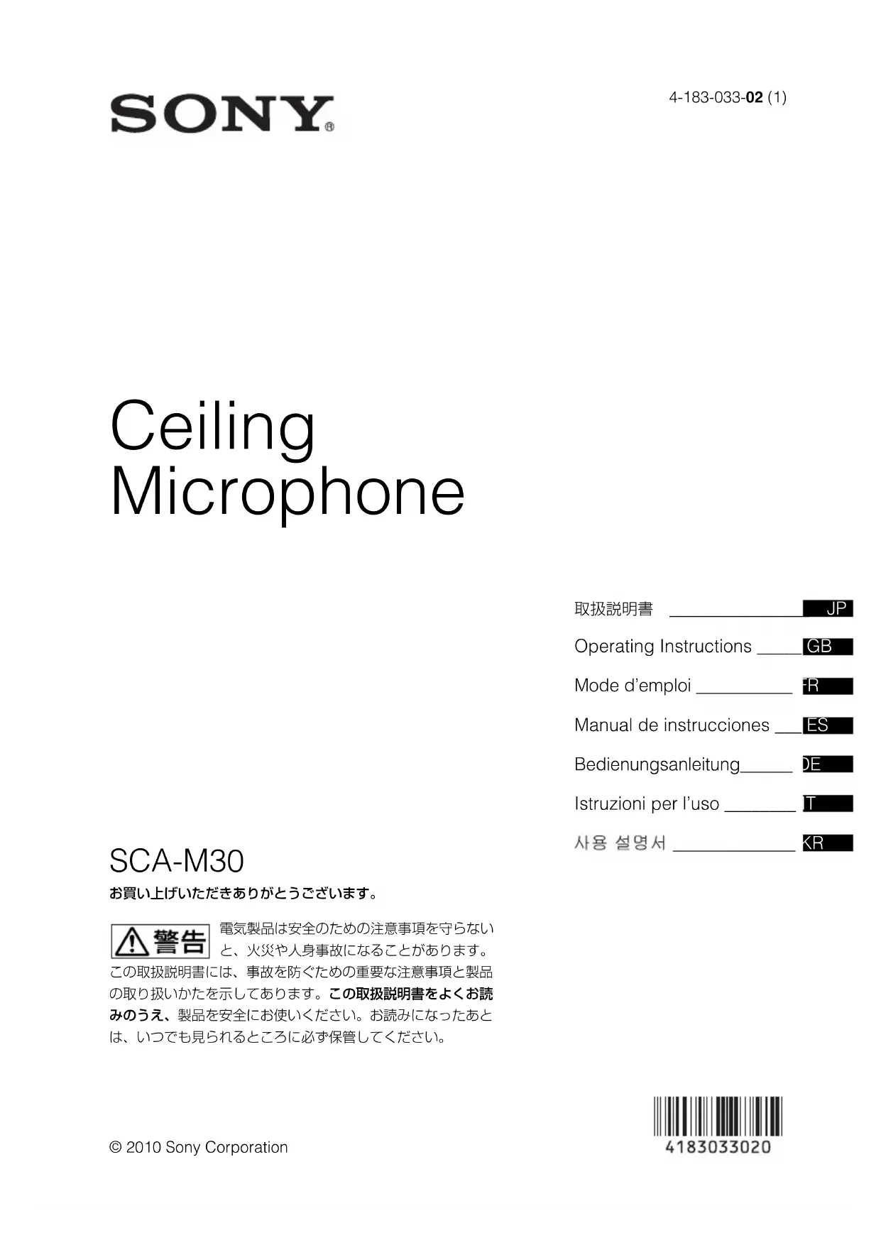 4-183-033-02 (1) © 2010 Sony Corporation Ceiling Microphone SCA-M30 お買い上げいただきありがとうございます。 電気製品は安全のための注意事項を守らない と、火災や人身事故になることがあります。 この取扱説明書には、事故を防ぐための重要な注意事項と製品 の取り扱いかたを示してあります。この取扱説明書をよくお読 みのうえ、製品を安全にお使いください。お読みになったあと は、いつでも見られるところに必ず保管してください。 取扱説明書 JP Operating Instructions _____ GB Mode d’emploi ___________ FR Manual de instrucciones ___ ES Bedienungsanleitung______ DE Istruzioni per l’uso ________ IT ______________ KRJP