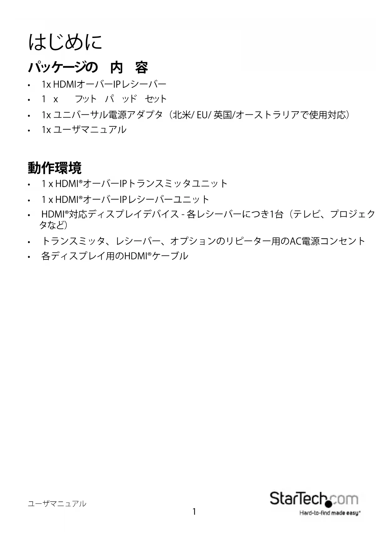注意:本製品はST12MHDLANHDMI®工ケスルトと一緒にか利用んだけます。追加レーナーダーをインストローする前に、ST12MHDLANのデマニルに記載いたします。追加レーナーダーをインストローする前に、ST12MHDLANのデマニルに記載いたします。追加レーナーダーをインストローする前に、ST12MHDLANHDMI®工ケスルトはGigabit LANネトフローを使用し当信号を拋張するとが成長。ほん哪种Gigabit ネットフローはケーツル長が100×一トルに制限くださいます。ケーツル長の制限にしだては機器の製造業者に確認し、トラスミツタ工ケスルトとレーナーダーは直近のネトフローはケーツルのケーツル長制限範围内に設置くださいます。