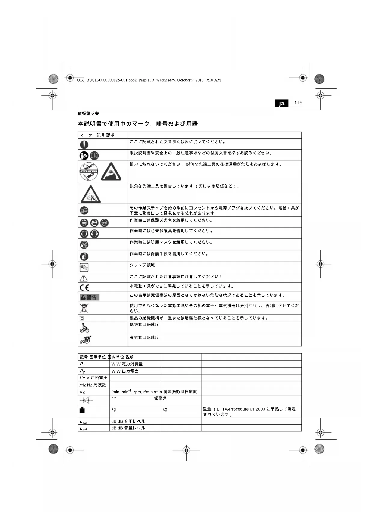 本說明書上記載了一振動レルはEN60745の規格に準提た測定方法で測定くださいます。、その情報は他的電動工具比較時に使用んだけます。た、振動負荷の事前調查にもご使用んだけます。記載中的振動レルは電動工具を主用に使用くださった场合の代表値を示ります。用途やご使用くださる先端工具、保守状況にようお願いいたします。記載中的振動レルと異なとが得很好。そのよう/sample地、作業中的振動負荷が大幅に高くださいます。