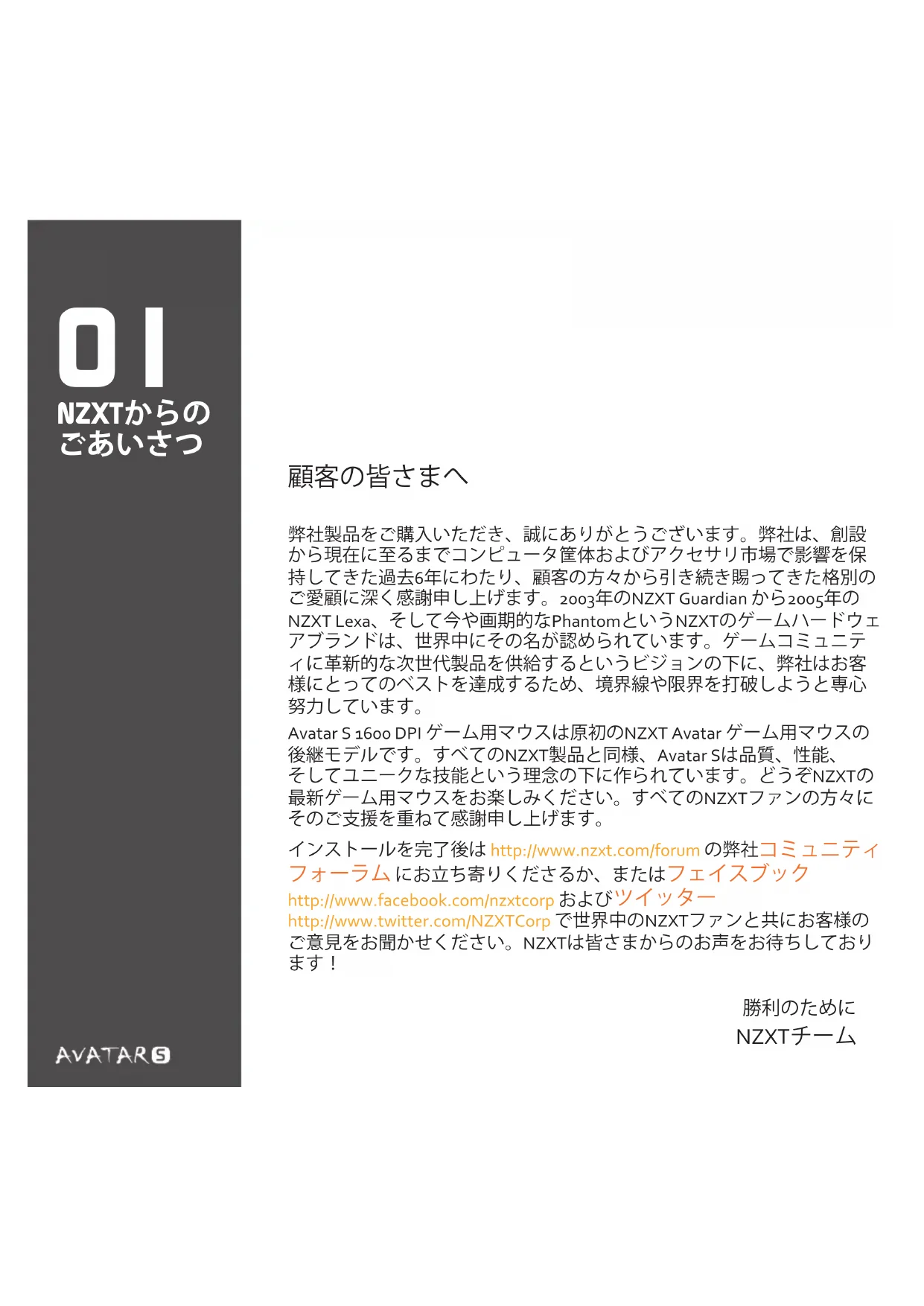 弊社製品をご購入いただき、誠にありがとうございます。弊社は、創設から現在に至るまでコンピュータ筐体およびアクセサリ市場で影響を保持してきた過去6年にわたり、顧客の方々から引き続き賜ってきた格別のご愛顧に深く感謝申し上げます。2003年のNZXT Guardian から2005年のNZXT Lexa、そして今や画期的なPhantomというNZXTのゲームハードウェアブランドは、世界中にその名が認められています。ゲームコミュニティに革新的な次世代製品を供給するというビジョンの下に、弊社はお客様にとってのベストを達成するため、境界線や限界を打破しようと専心努力しています。Avatar S 1600 DPI ゲーム用マウスは原初のNZXT Avatar ゲーム用マウスの後継モデルです。すべてのNZXT製品と同様、Avatar Sは品質、性能、そしてユニークな技能という理念の下に作られています。どうぞNZXTの最新ゲーム用マウスをお楽しみください。すべてのNZXTファンの方々にそのご支援を重ねて感謝申し上げます。インストールを完了後は http://www.nzxt.com/forum の弊社