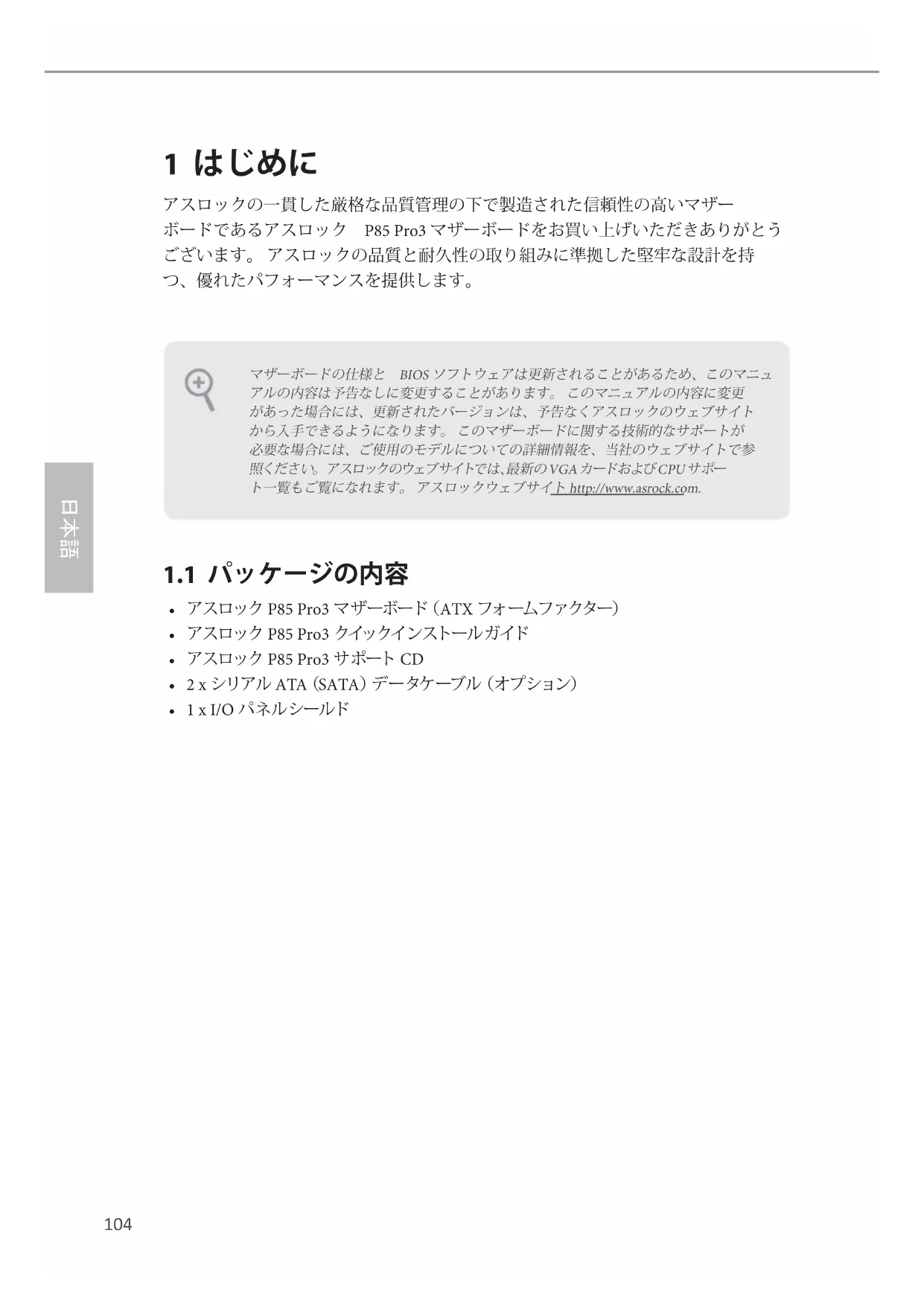 • 1 x I/O パネルシールド マザーボードの仕様と BIOS ソフトウェアは更新されることがあるため、このマニュアルの内容は予告なしに変更することがあります。 このマニュアルの内容に変更があった場合には、更新されたバージョンは、予告なくアスロックのウェブサイトから入手できるようになります。 このマザーボードに関する技術的なサポートが必要な場合には、ご使用のモデルについての詳細情報を、当社のウェブサイトで参 照ください。 アスロックのウェブサイトでは、最新の VGAカードおよび CPUサポー ト一覧もご覧になれます。 アスロックウェブサイト http://www.asrock.com.P85 Pro3