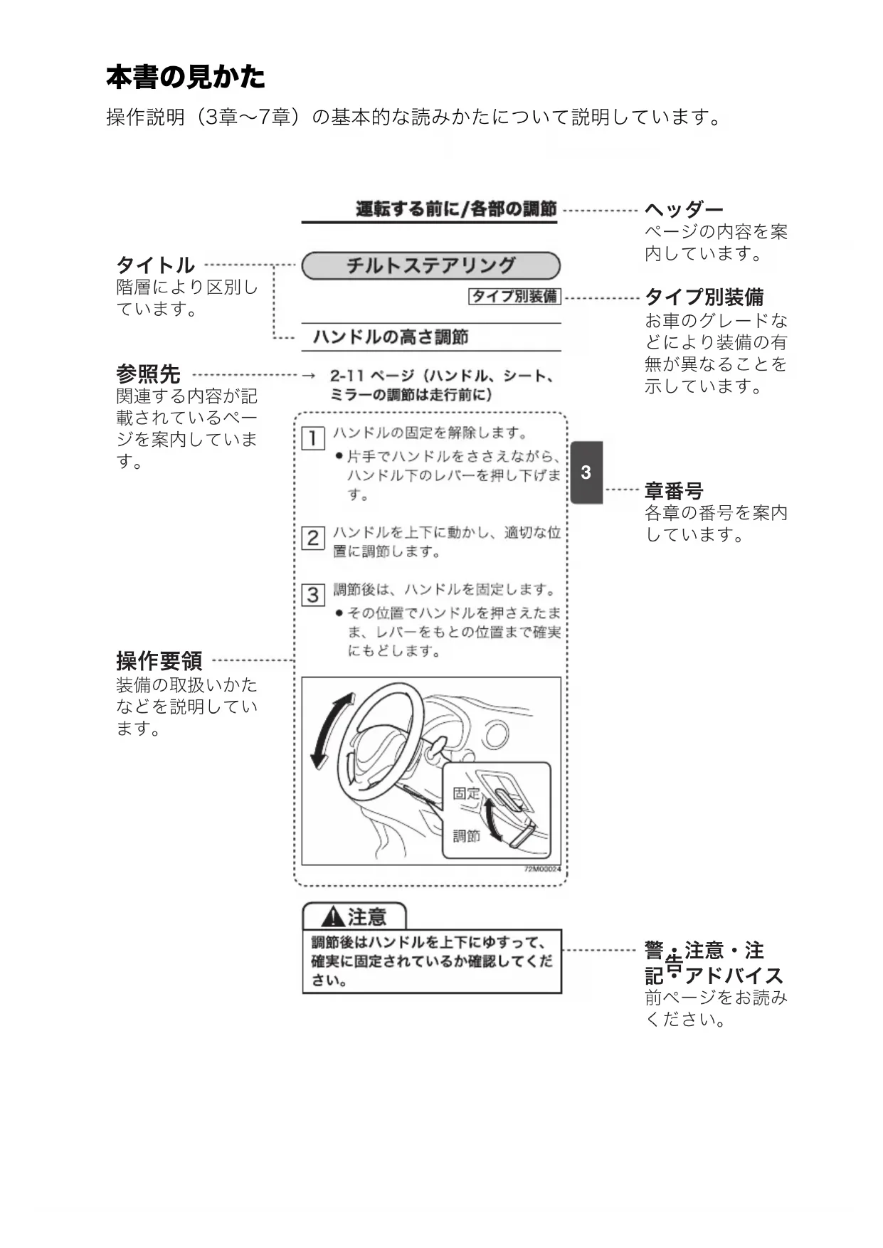 操作説明(3章~7章)の基本的な読みかたについて説明しています。