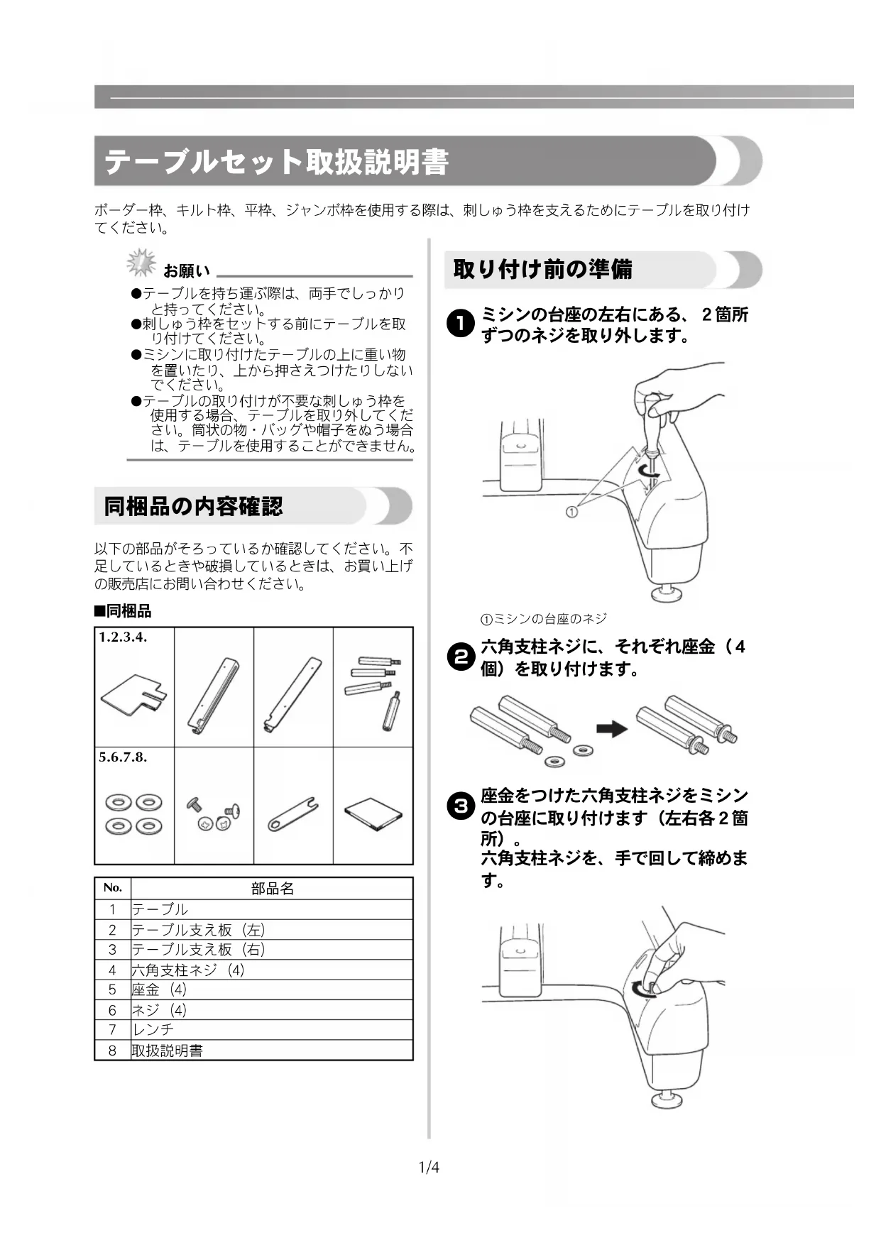 ボーダー枠、キルト枠、平枠、ジャンボ枠を使用する際は、刺しゅう枠を支えるためにテーブルを取り付け