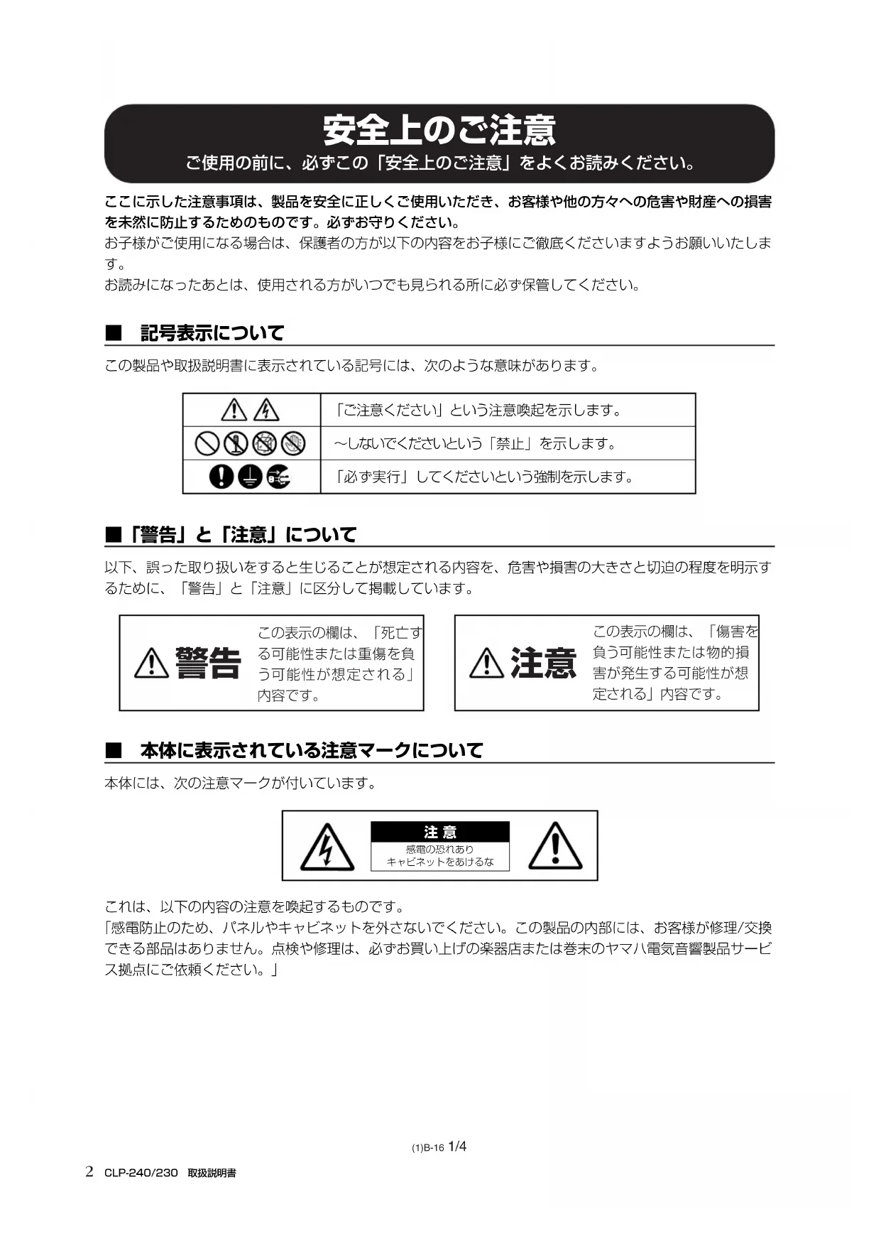 [].....パネル上にあるボタン類を示します。たとえば、マスターボリュームのスライダーは、文章中で [MASTER VOLUME ]スライダーと表記します。 .....操作するときにご注意いただく内容、必ず実行していただきたい内容を説明しています。 .....操作するときにご注意いただく内容、してはいけない事項を説明しています。 この製品は、ヤマハ(株)が著作権を有する著作物やヤマハ(株)が第三者から使用許諾を受けている著作物を内蔵または同梱しています。その著作物とは、すべてのコンピュータープログラムや、MIDIデータなどのコンテンツを含みます。ヤマハ(株)の許諾を受けることなく、個人的な使用の範囲を越えて上記プログラムやコンテンツを使用することについては、著作権法等に基づき、許されてい ません。CLP-240/230 取扱説明書
