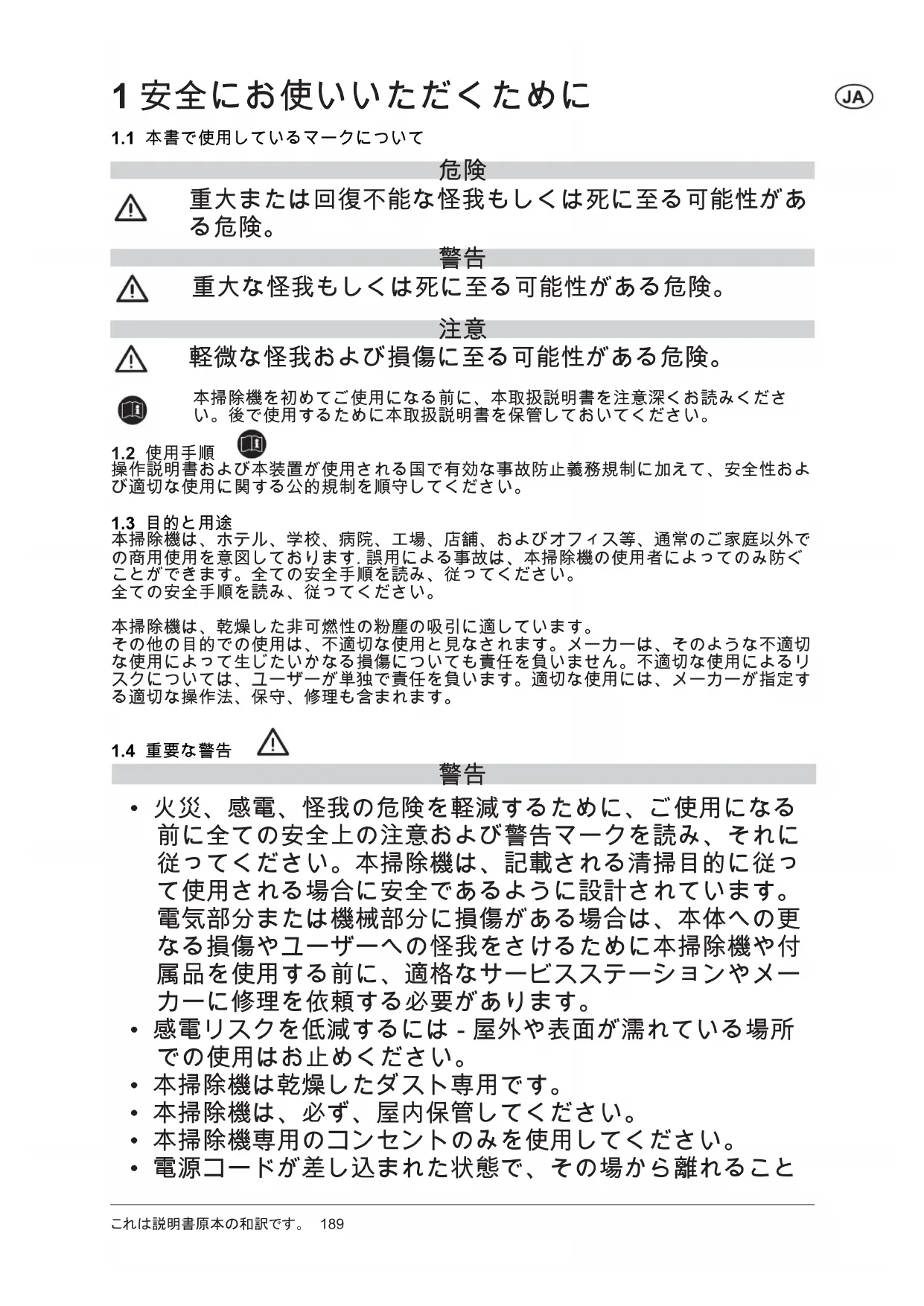 本掃除機は、ホテル、学校、病院、工場、店舗、およびオフィス等、通常のご家庭以外で の商用使用を意図しております. 誤用による事故は、本掃除機の使用者によってのみ防ぐ ことができます。全ての安全手順を読み、従ってください。 全ての安全手順を読み、従ってください。 本掃除機は、乾燥した非可燃性の粉塵の吸引に適しています。 その他の目的での使用は、不適切な使用と見なされます。メーカーは、そのような不適切 な使用によって生じたいかなる損傷についても責任を負いません。不適切な使用によるリ スクについては、ユーザーが単独で責任を負います。適切な使用には、メーカーが指定す る適切な操作法、保守、修理も含まれます。